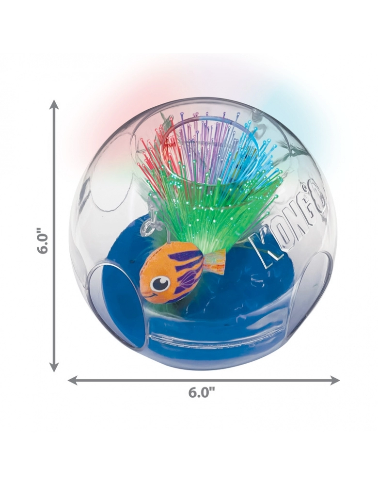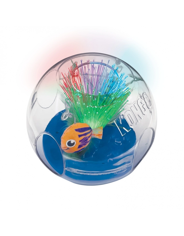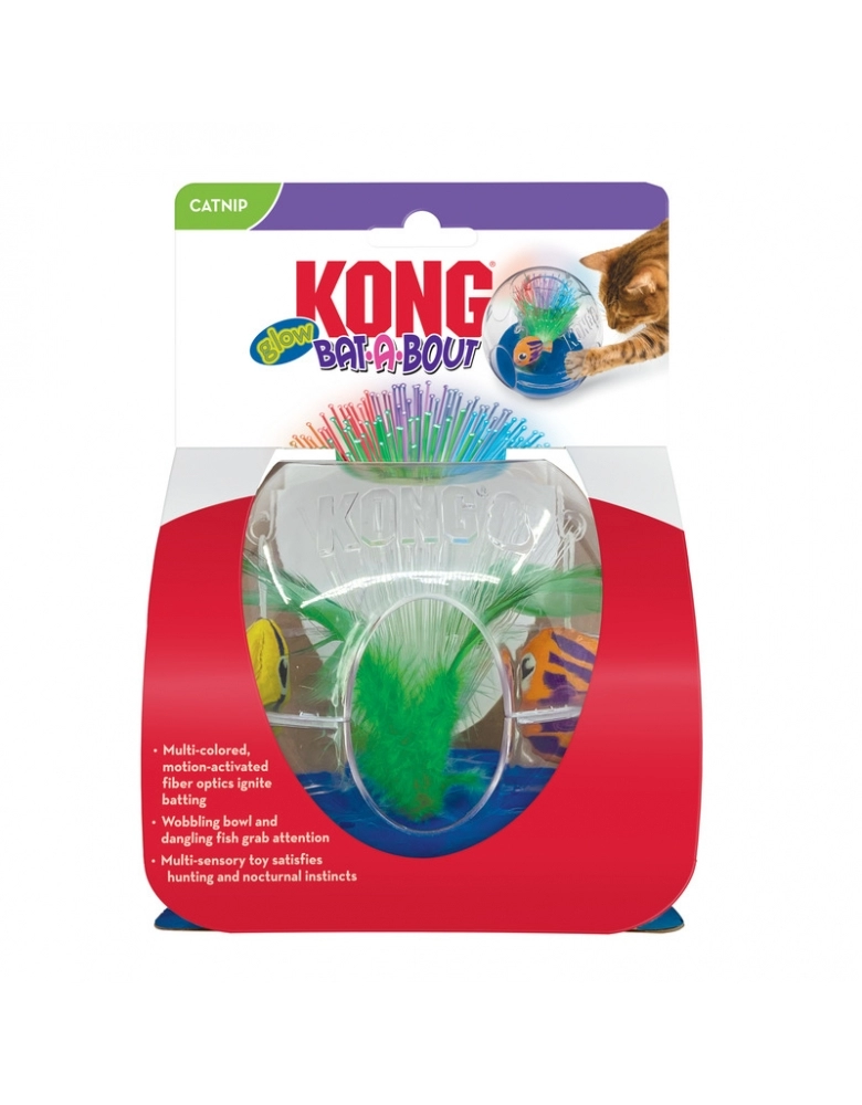 KONG Bat-a-Bout Glow Aquarium possui fibras óticas que brilham quando os gatos cutucam o aquário, iluminando um fundo do mar irresistível e ondulado, cheio de luzes à medida que as fibras se movem., tornando-se um convite irresistível à batidas e satisfazendo os instintos noturnos. O aquário que balança, os peixes pendurados e o movimento das penas intrigam e o Catnip especial da KONG aumentam ainda mais a diversão. Baterias incluídas. Possui botão de ligar e desligar