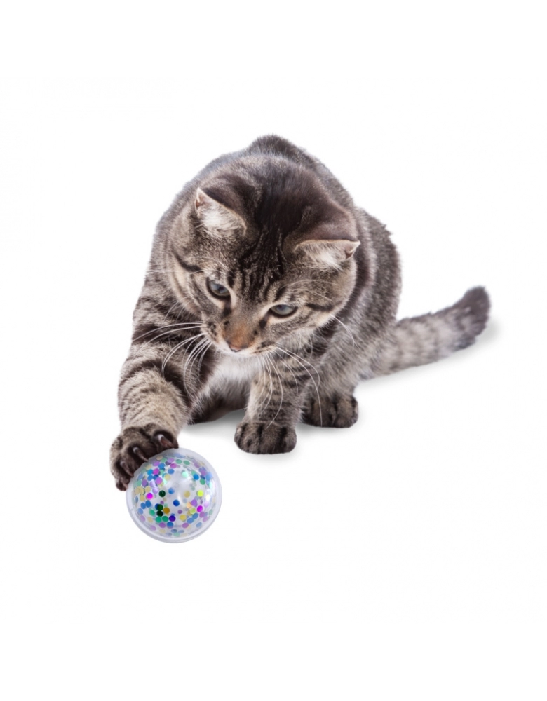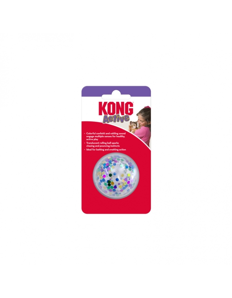 KONG Confetti Ball é uma festa em uma bola. Essa bola que rola e brilha com seus confetes dentro é diversão para um ou mais gatos que adorem brincar, assim como gatos que necessitam mais estímulos em sua rotina diária. Essa bola estimula múltiplos sentidos e estimula perseguição, batidas com as patas e lutas que fazem com que seu gato movimente todo seu corpo.