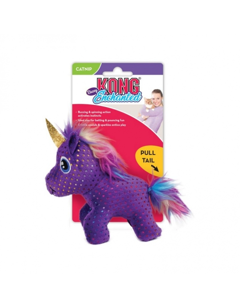 O brinquedo KONG Enchanted Buzzy atrai gatos com um movimento irresistível de zumbido que envolve seus instintos naturais. O zumbido e o giro começam quando a cauda do unicórnio é puxada, ativando a pegada natural do gato e capturando os desejos de brincar. Estendendo a diversão estão os sons crinkle, cores brilhantes e KONG North American Premium Catnip, tudo somado para manter os gatinhos ocupados para um divertido recreio mágico.