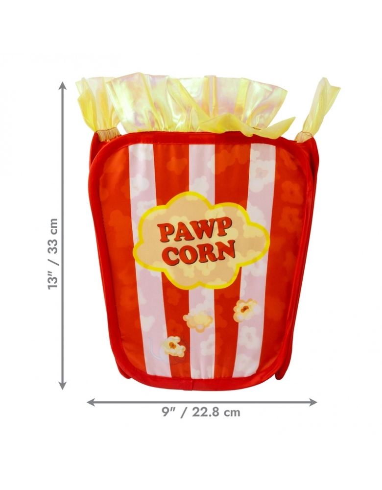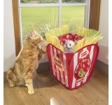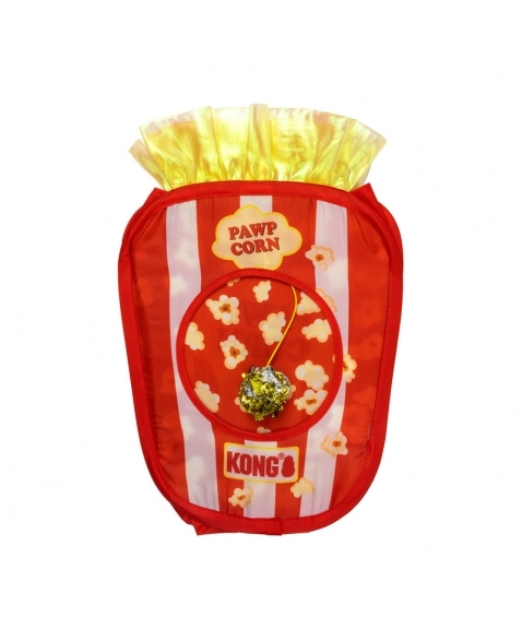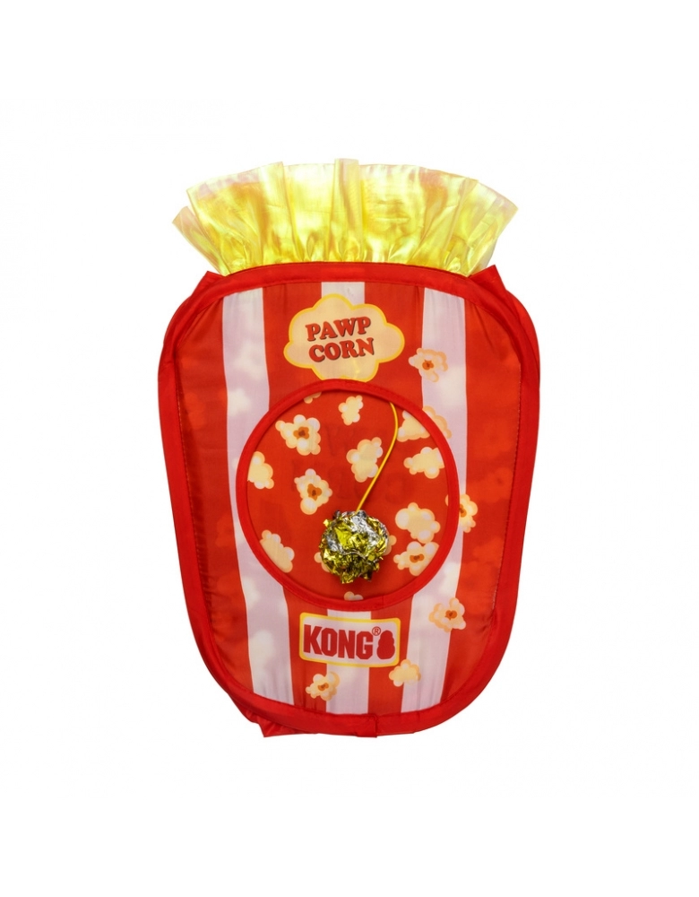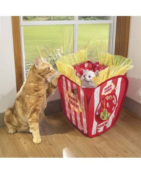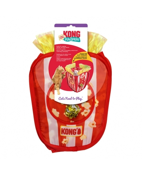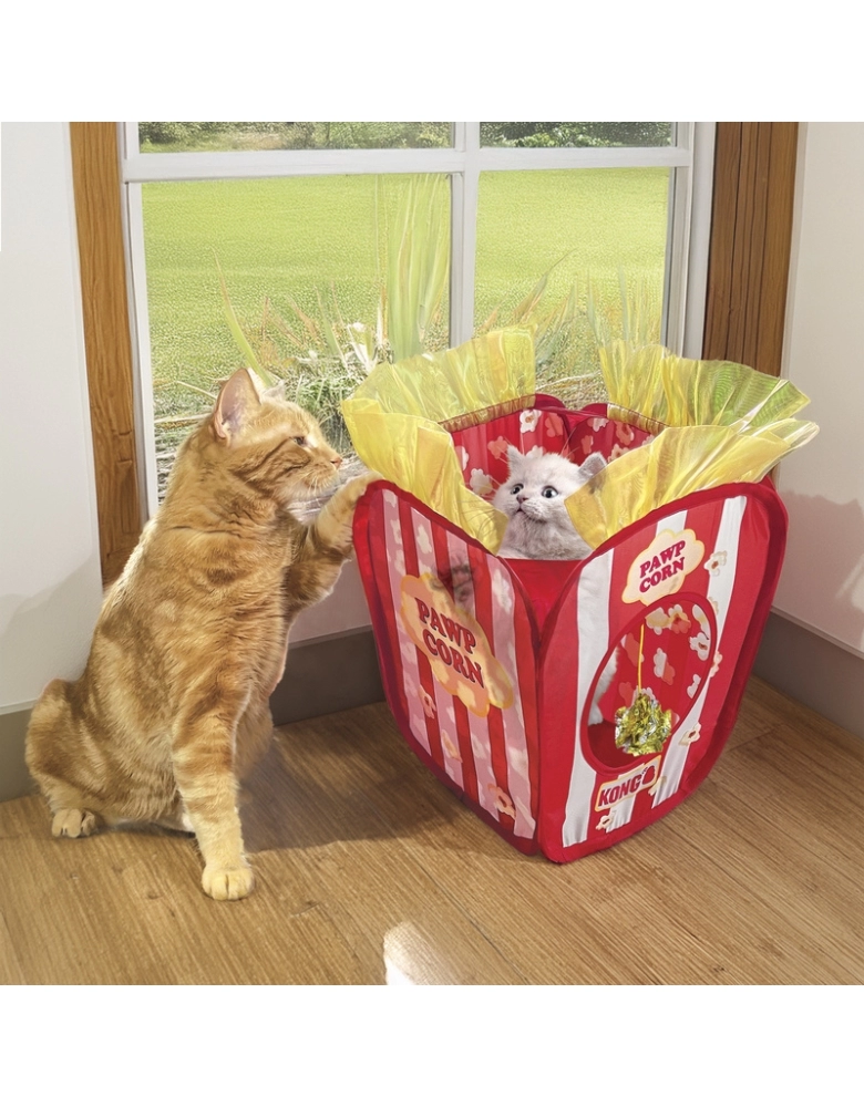KONG Playspaces Pawpcorn. Por sua característica de preservação natural, gatos precisam de espaços pequenos para se abrigarem de predadores e ameaças. Seu instinto de preservação pede esse tipo de ambiente, mesmo dentro de casa. Essa tenda tem uma abertura em cima, para brincadeiras e uma porta de entrada . Você pode usar em pé ou deitado para variar as brincadeiras. Possui um pingente divertido que produz estalidos para estimular seu gato a bater as patinhas e morder. . Essa tenda se dobra inteiramente, tornando-a conveniente e fácil de guardar ou levar em uma viagem. Importante: Inspecione o brinquedo com frequência e descarte caso apresente danos. Remova toda a embalagem antes de oferecer ao gato. Remova o elástico para abrir a tenda.