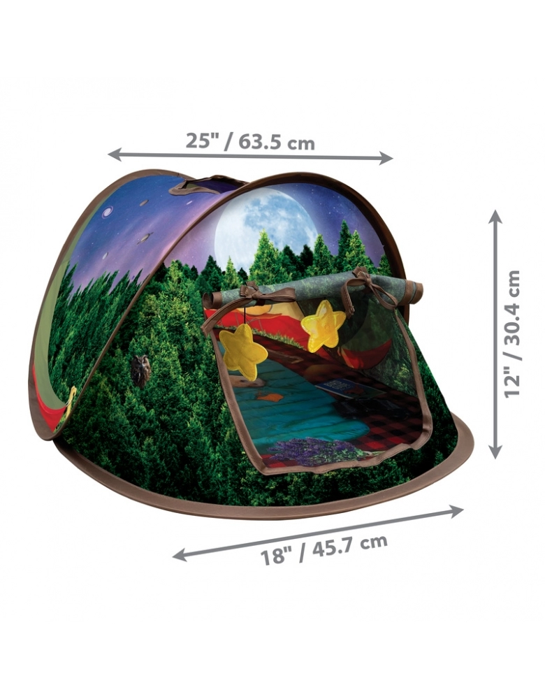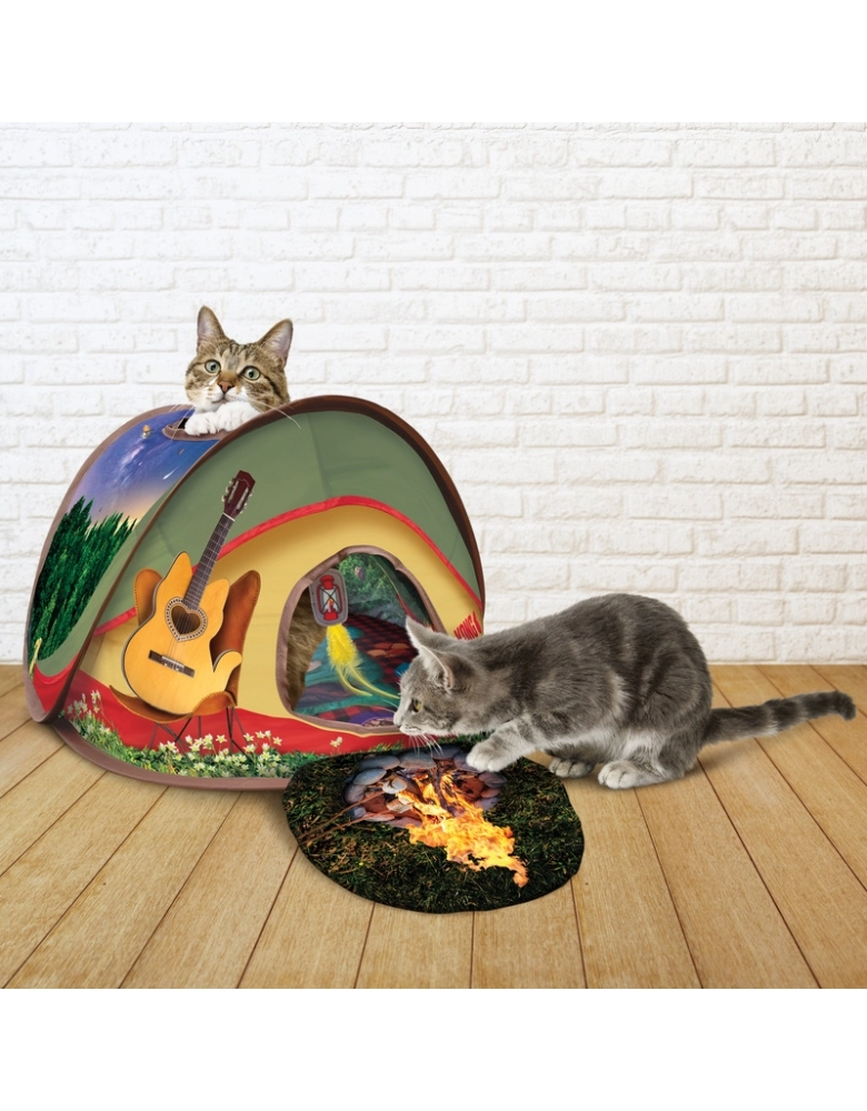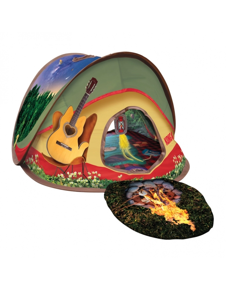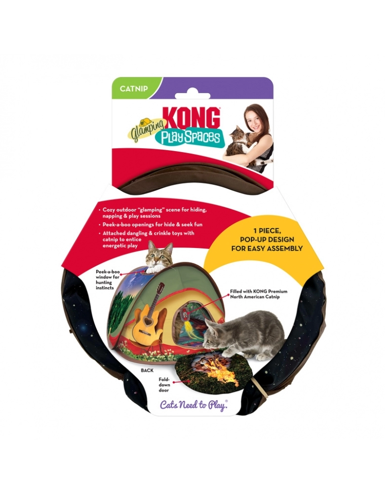 KONG Play Spaces Glamping Tent traz a aventura para dentro de casa para gatinhos curiosos que querem ver como é acampar fora de casa. Por sua característica de preservação natural, gatos precisam de espaços pequenos para se abrigarem de predadores e ameaças. Seu instinto de preservação pede esse tipo de ambiente, mesmo dentro de casa. Essa tenda tem uma abertura no teto para brincadeiras e uma porta de entrada que pode ser enrolada para permanecer aberta ou desenrolada para dar mais privacidade. Dentro da tenda, materiais que produzem estalidos estimulam enquanto lutas podem ser travadas enquanto que uma lanterna cheia de catnip convida para intermináveis brincadeiras. Essa tenda se dobra inteiramente, tornando-a conveniente e fácil de guardar ou levar em uma viagem. Importante: Inspecione o brinquedo com frequência e descarte caso apresente danos. Remova toda a embalagem antes de oferecer ao gato. Renova o elástico para abrir a tenda.