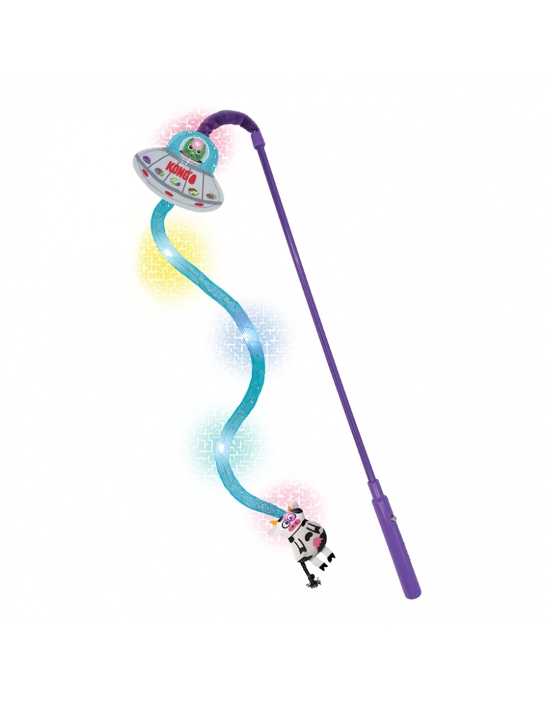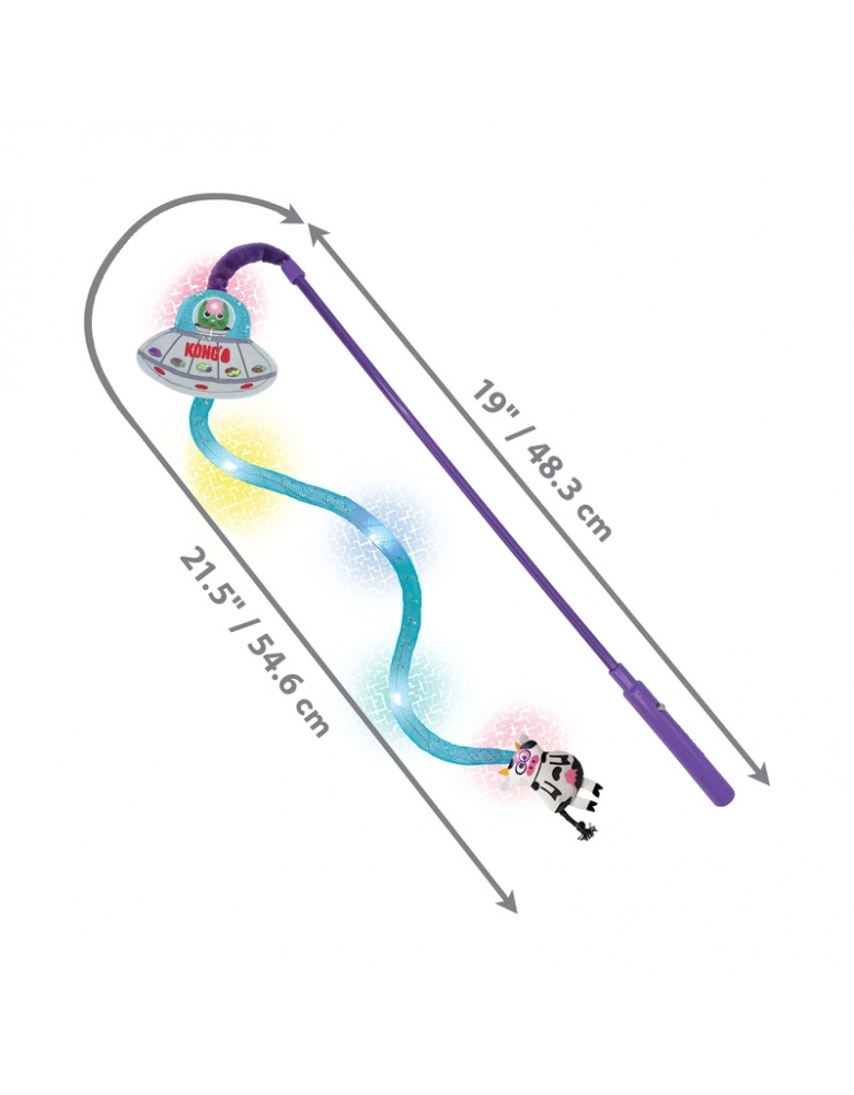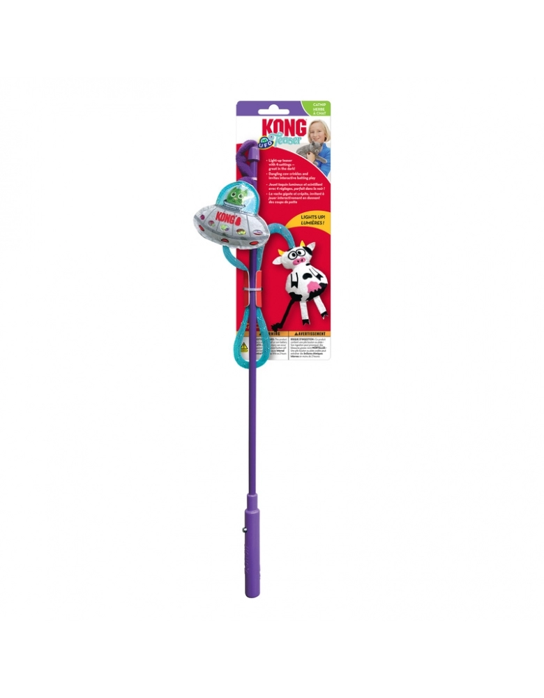 KONG Teaser UFO (objeto felino não identificado) possui luzes entre a varinha e a vaca. Aperte o botão para brilho estático, pisca-pisca ou pisca-pisca acelerado para uma aventura de outro mundo. Movimentar a varinha é convidar seu gato para uma luta de tapas e mordidas. Recheado com o Catnip Exclusivo da KONG, a vaquinha também produz estalidos