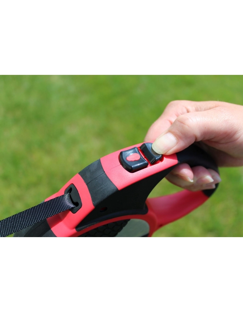 Para trazer seu cão para perto, nunca toque a fita. Coloque seu braço para frente e aperte o freio. Ande para frente e ao mesmo tempo jogue seu braço com a guia para trás. Solte o freio e leve seu braço em direção ao cão e aperte novamente o freio.