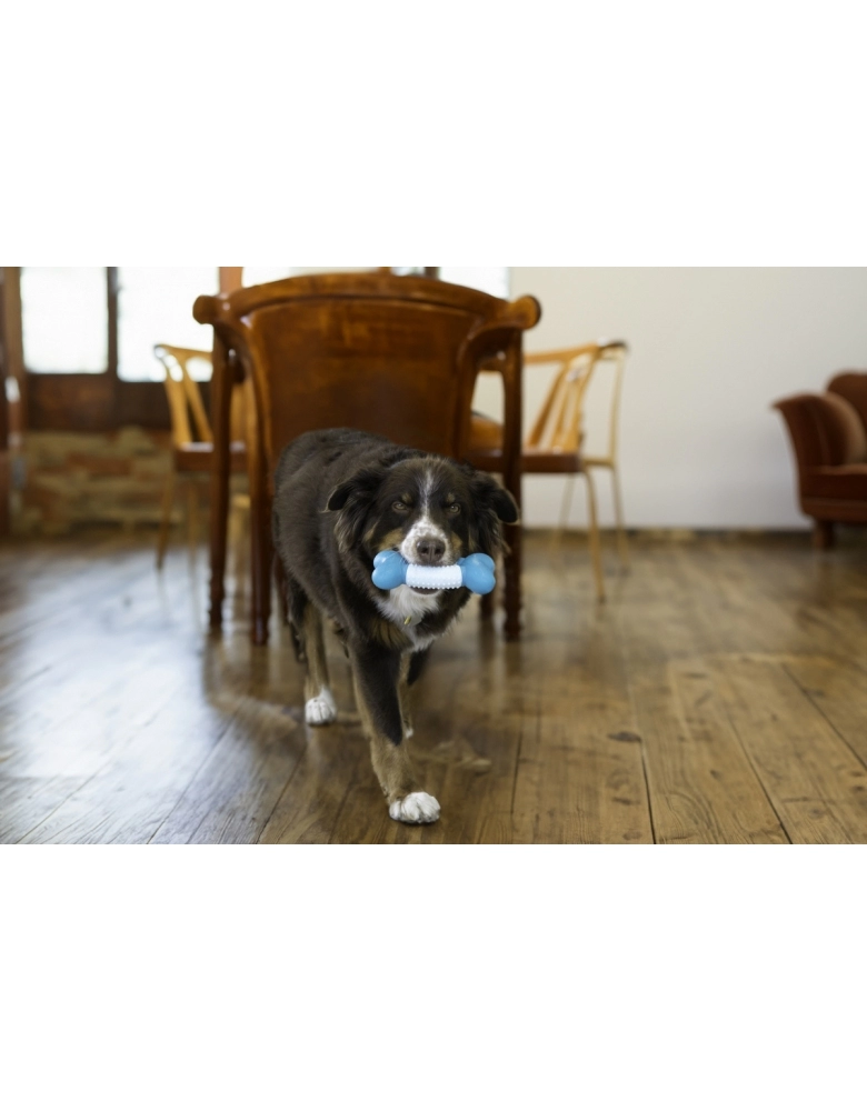 KONG Duos Dental é um brinquedo desenvolvido para que o cão morda e com isso esfregue os dentes em seu material, o que ajuda a limpar os dentes e a língua. Textura dupla para satisfazer seus instintos de morder. Fácil de agarrar para brincadeiras de jogar e buscar. É imprescindível oferecer somente a cães de mordidas leves a moderadas. Para cães de mordidas destrutivas e poderosas, prefira sempre brinquedos KONG da linha de borracha.