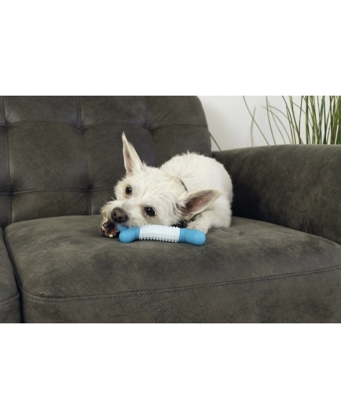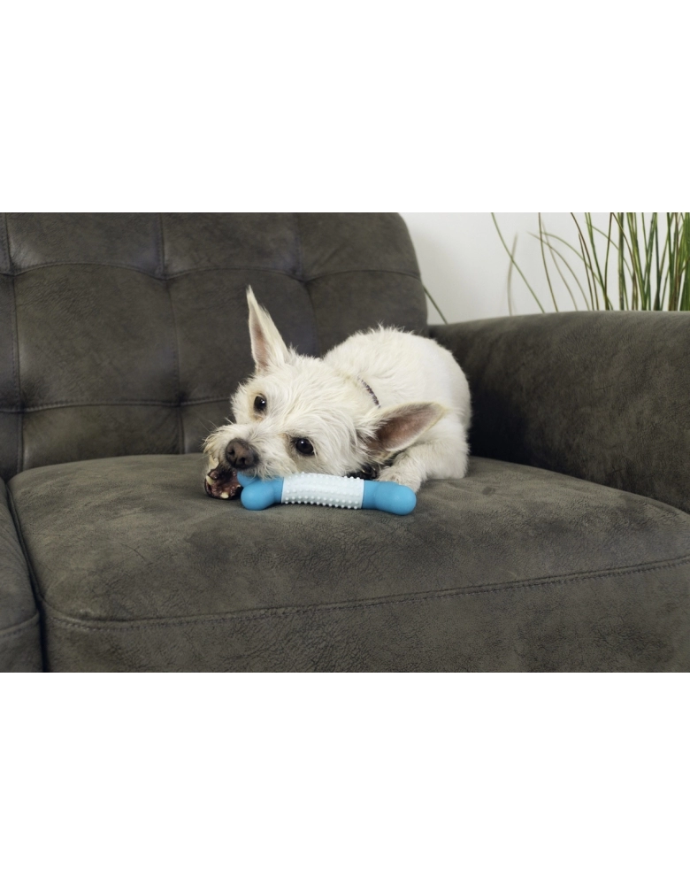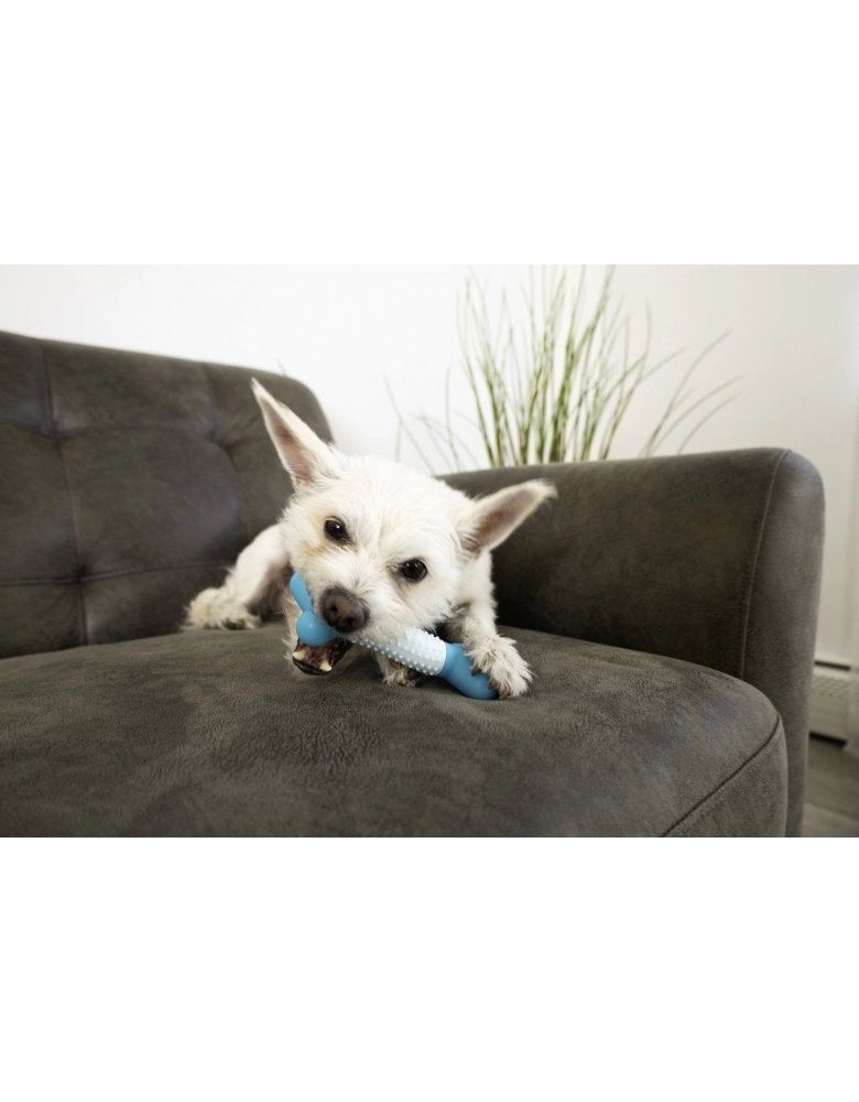 KONG Duos Dental é um brinquedo desenvolvido para que o cão morda e com isso esfregue os dentes em seu material, o que ajuda a limpar os dentes e a língua. Textura dupla para satisfazer seus instintos de morder. Fácil de agarrar para brincadeiras de jogar e buscar. É imprescindível oferecer somente a cães de mordidas leves a moderadas. Para cães de mordidas destrutivas e poderosas, prefira sempre brinquedos KONG da linha de borracha.