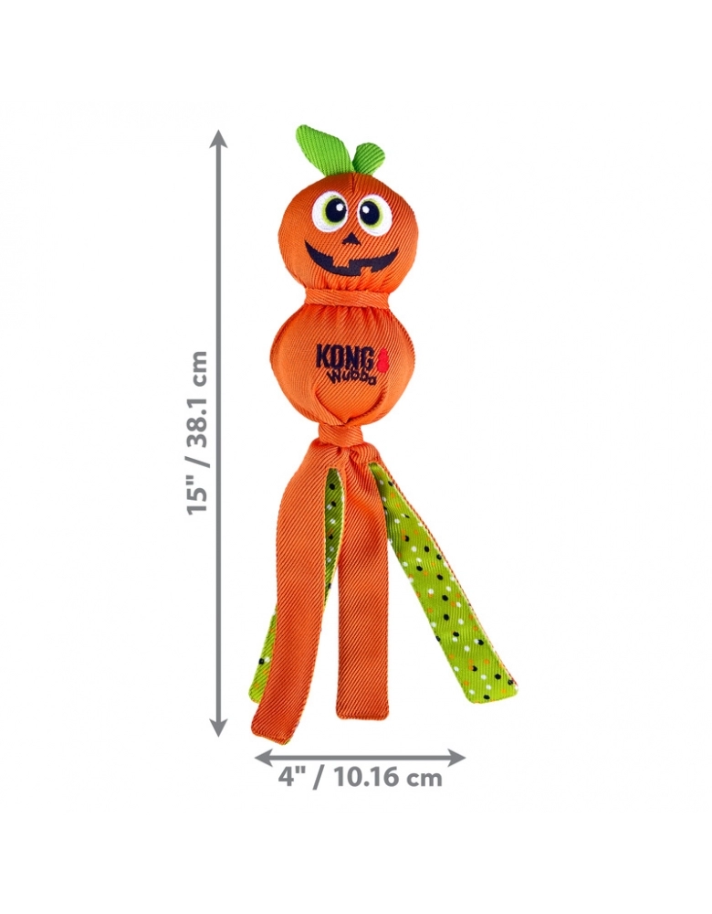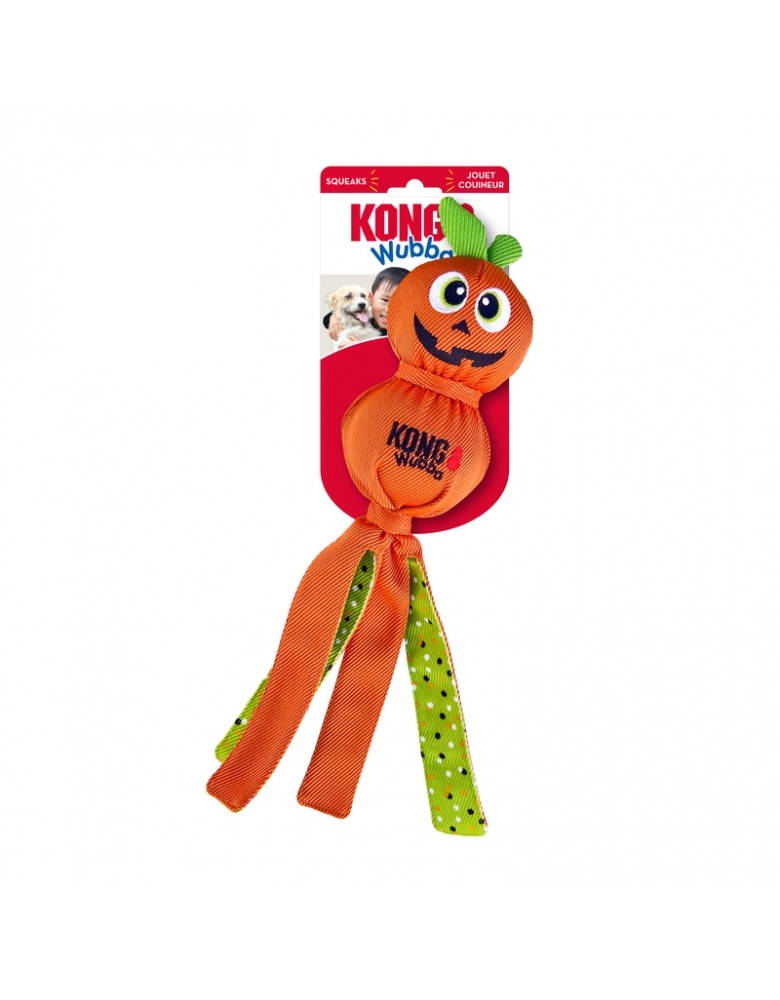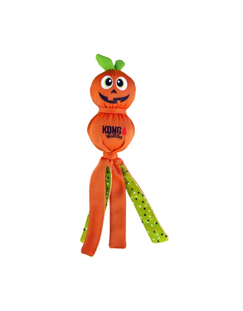 KONG Haloween Wubba Ballistic é um brinquedo desenvolvido para cães de mordida leve e não destruidores. Brinquedo desenvolvido para brincadeiras de jogar e buscar, e para satisfazer os instintos naturais do cão de chacoalhar a presa capturada. Sua cauda solta simula pernas em luta. Além disso, servem para segurar o brinquedo e arremessa-lo mais longe. Seu tecido reforçado garante uma durabilidade maior se usado corretamente. Possui um apito para aumentar o engajamento.