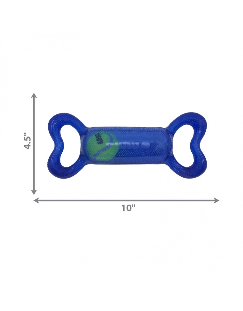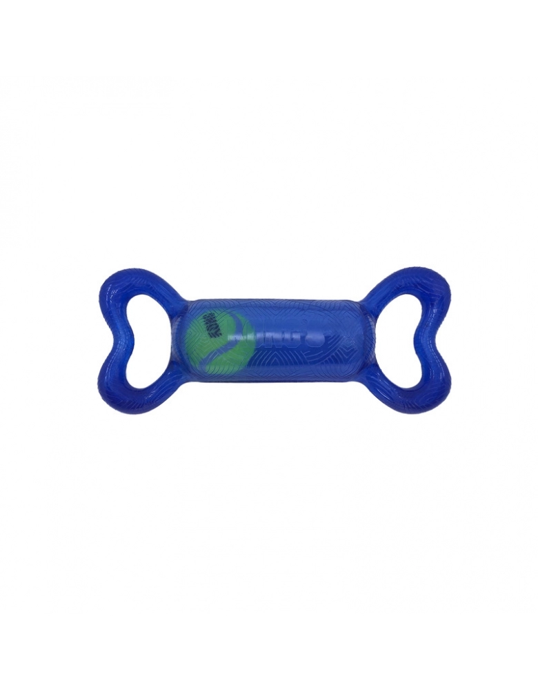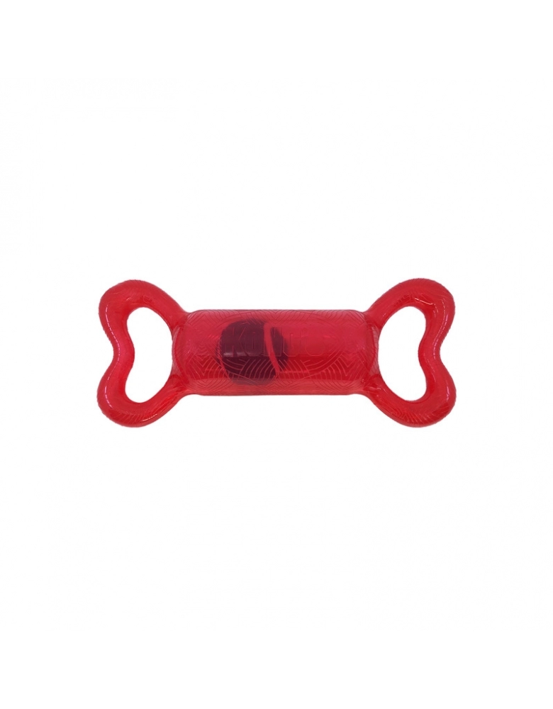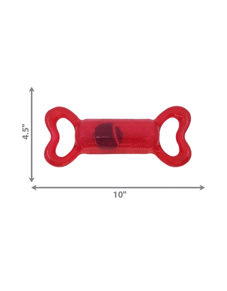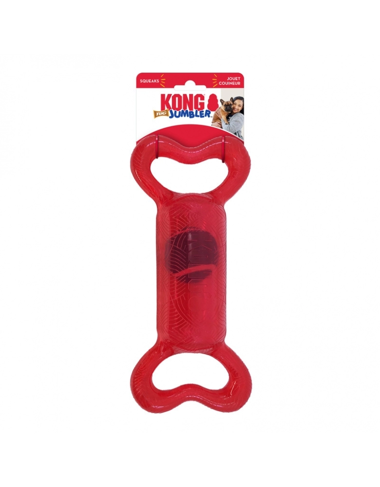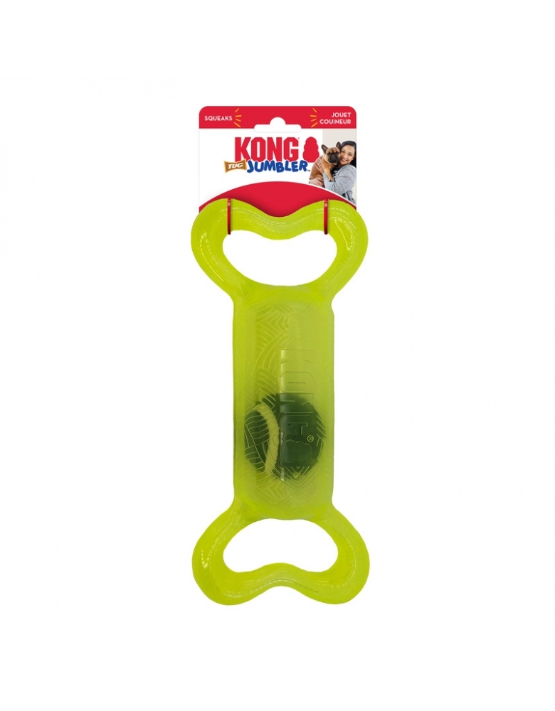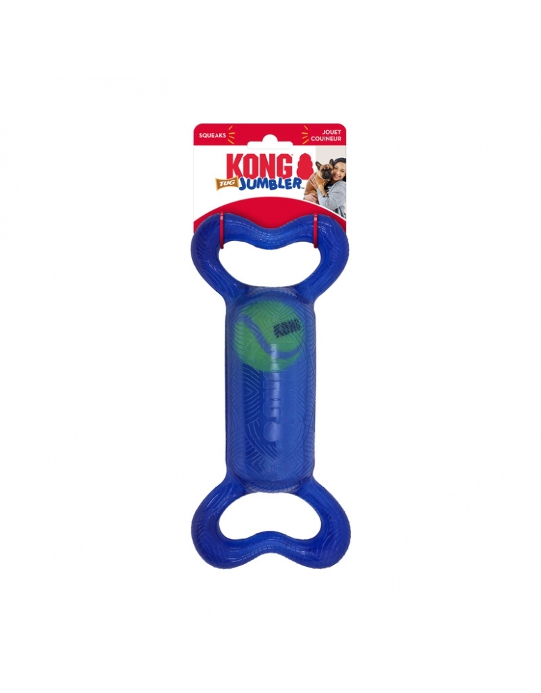 KONG Jumbler Tug é um brinquedo feito para brincadeiras interativas. As manoplas laterais servem para uma pegada fácil e firme. A bola de tênis aumenta a diversão. Perfeito para brincadeiras de chacoalhar e interativas como jogar e buscar, cabos de guerra leves, etc. Possui apito para estimular ainda mais o seu cão.