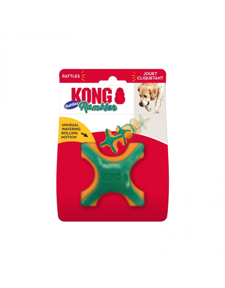 KONG Rambler Rattlez é um brinquedo feito para brincadeiras de jogar e trazer que possui um quique nada previsível e que provoca os instintos naturais dos cães de perseguir a presa. Possui grânulos internos que estimulam ainda mas. Prazeirosos para morder e brincar.