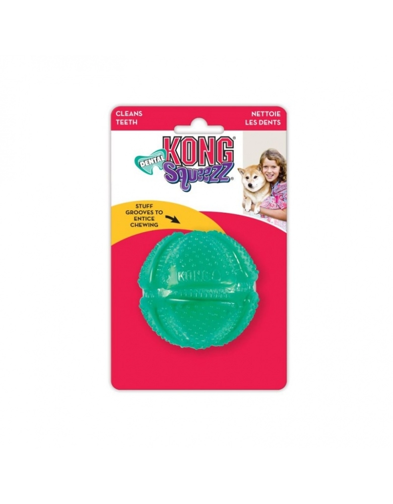 KONG Dental Sqeezz Dental Ball é um produto destinado à cães com mordida moderada que satisfaz a necessidade de morder. Enquanto seu cão morde o brinquedo, sua textura única se esfrega aos dentes, auxiliando muito na limpeza. Preenchendo o brinquedo com um recheio saboroso, irá torná-lo ainda mais estimulante para ser mordido por mais tempo. A maneira que o cão morde e o brinquedo fexiona, permitem uma limpeza profunda. Morder um KONG Squeezz Dental é uma maneira divertida de previnir problemas clínicos com dentes e gengivas.