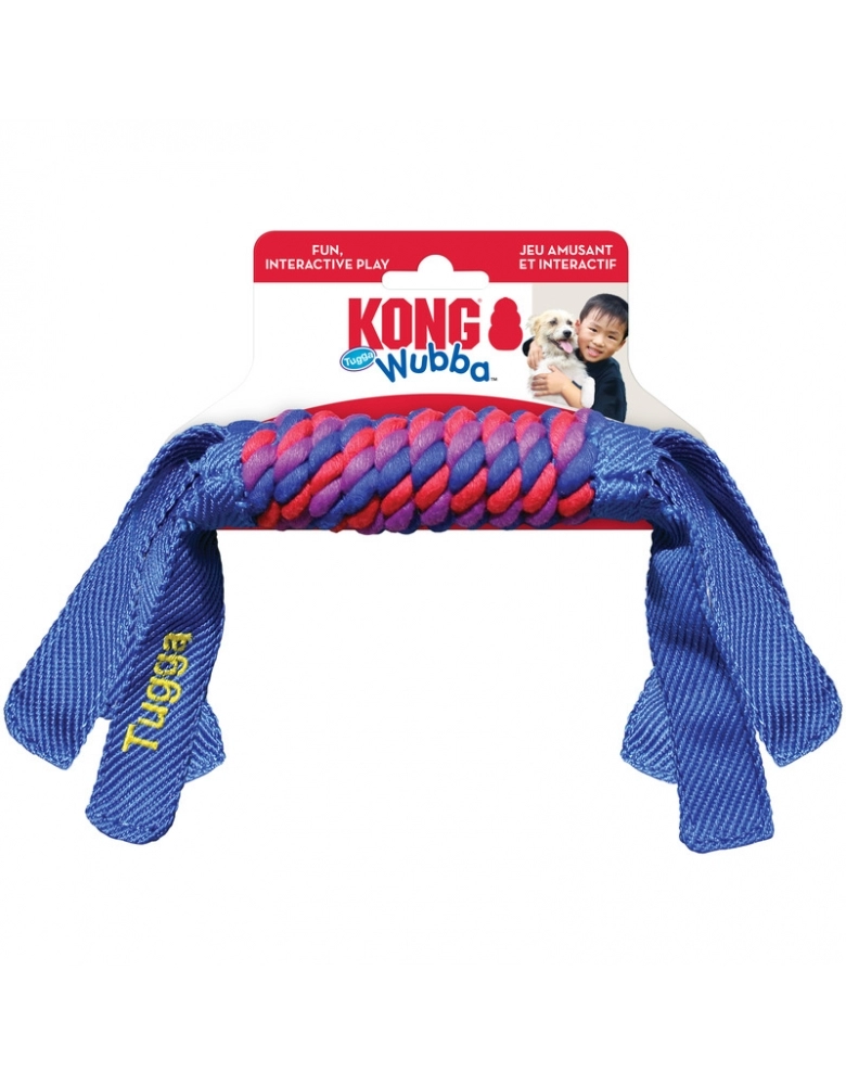 KONG Yugga Wubba é um brinquedo desenvolvido para cães de mordida leve/ moderada. Desenvolvido para brincadeiras de jogar e buscar, e para satisfazer os instintos naturais do cão de chacoalhar a presa capturada. Suas caudas, uma de cada lado, simula pernas em luta. Além disso, servem para segurar o brinquedo e arremessa-lo mais longe. Seu tecido reforçado e corpo de corda, garantem uma durabilidade maior se usado corretamente.