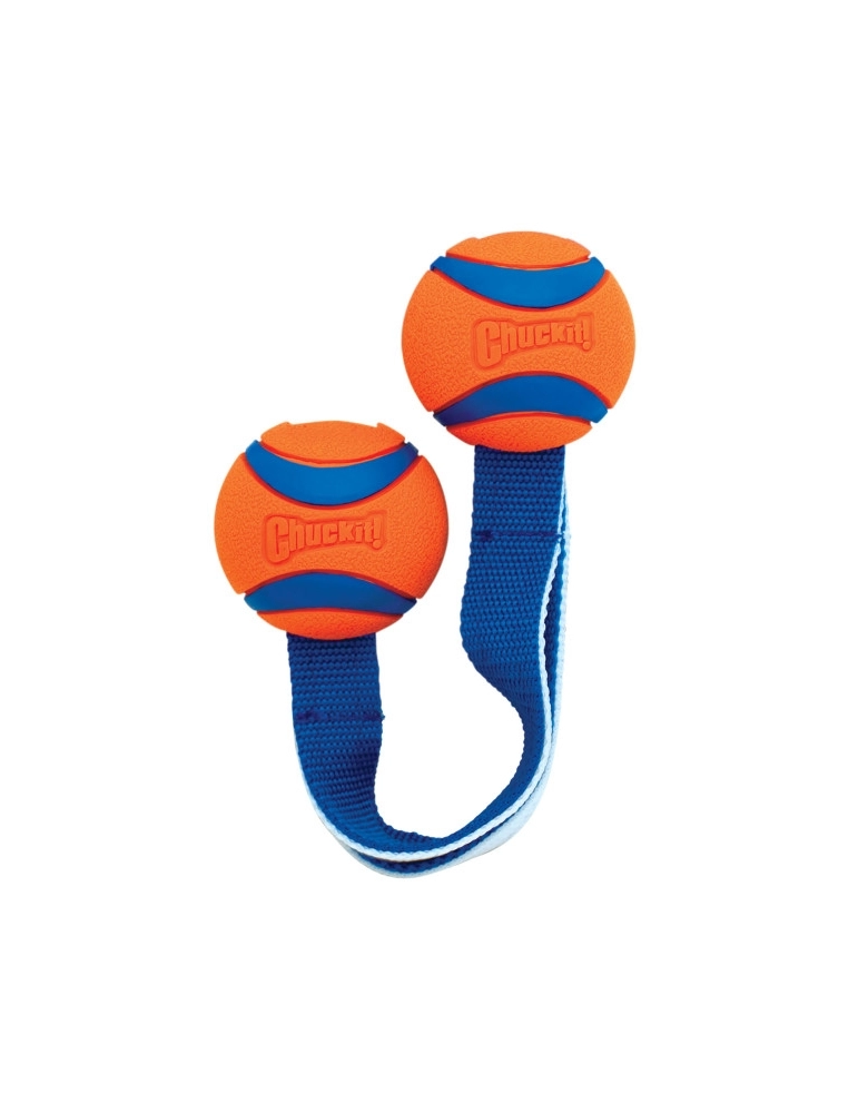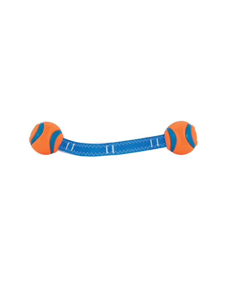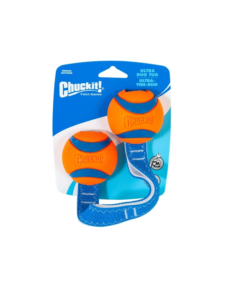 Chuckit! Ultra Duo Tug é um brinquedo que ultrapassa o comum. Possui uma fita de nylon ultra resistente com uma bolinha Ultra de borracha em cada ponta. Feito para ter alto quique, alta visibilidade e alta durabilidade. As bolas nas pontas são confortáveis na boca do cão na hora de brincar de cabo de guerra. Não possui apito.