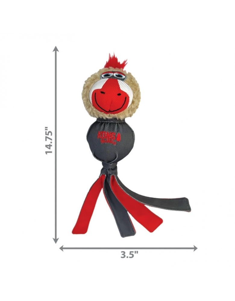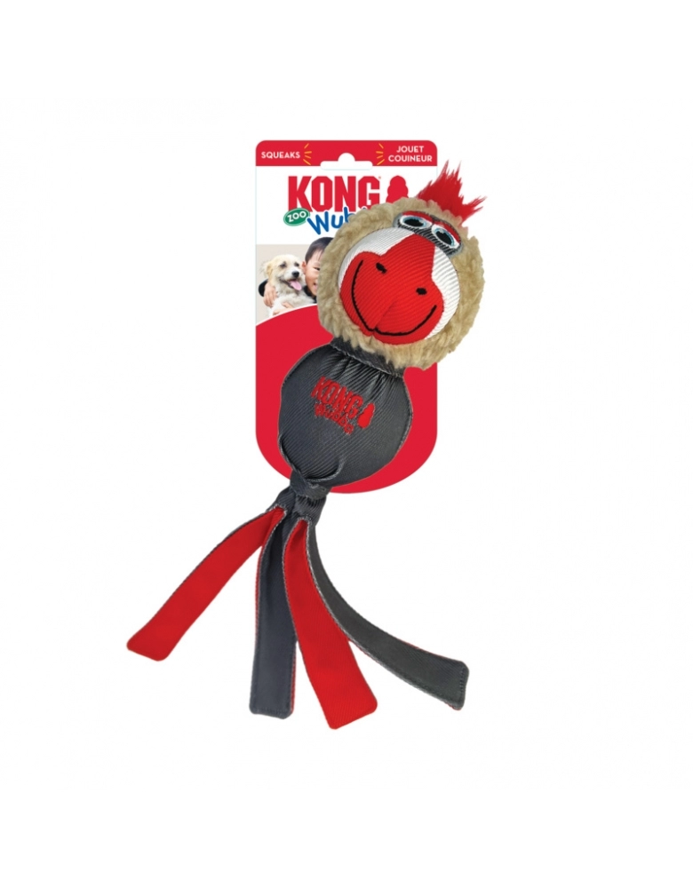 KONG Wubba Zoo é um brinquedo desenvolvido para cães de mordida leve e não destruidores. Brinquedo desenvolvido para brincadeiras de jogar e buscar, e para satisfazer os instintos naturais do cão de chacoalhar a presa capturada. Sua cauda solta simula pernas em luta. Além disso, servem para segurar o brinquedo e arremessa-lo mais longe. Seu tecido reforçado garante uma durabilidade maior se usado corretamente. Possui um apito para aumentar o engajamento.