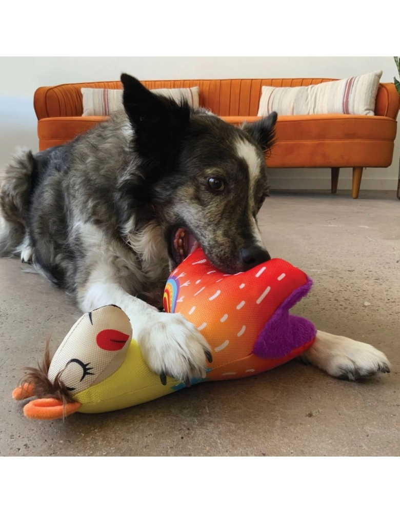 Importante: Não é um brinquedo de mastigar. Não deixe o cão sozinho com o brinquedo se não quiser que o mesmo seja destruído. Feito para brincadeiras interativas. Acabada a brincadeira, retire do cão e guarde. Designado a cães de mordida leve/moderada. Para cães de mordidas mais fortes, procure um brinquedo KONG de borracha.