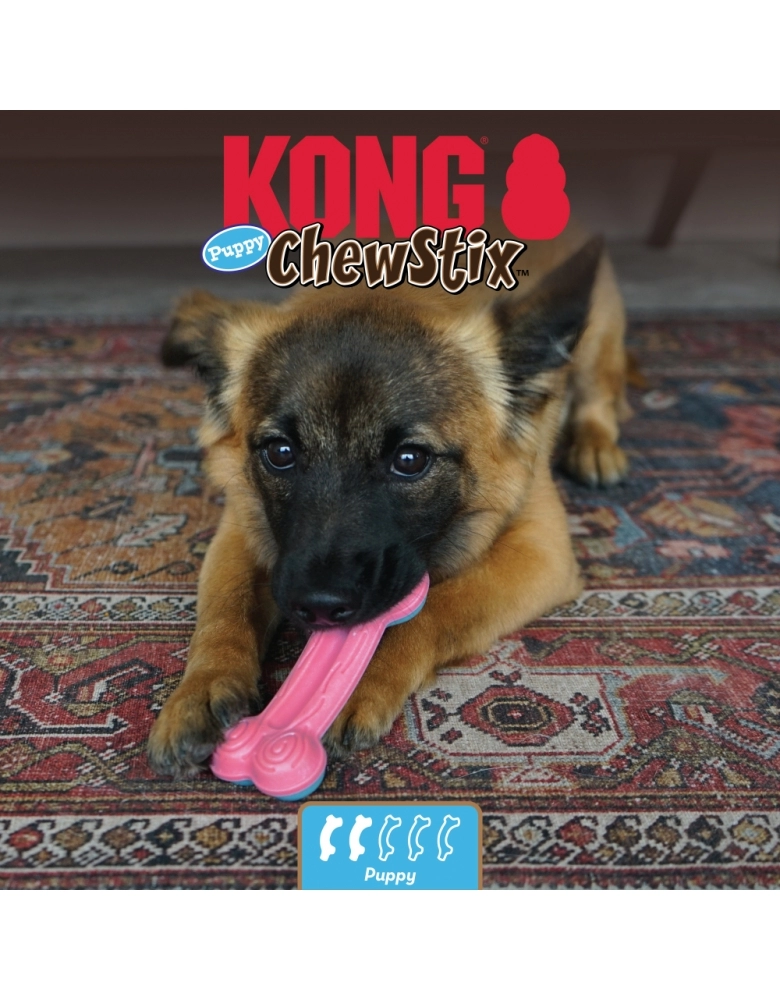 KONG ChewStix Puppy é o primeiro brinquedo de roer de seu cão, feito com Nylon e Madeira de verdade formulado com toda segurança para seu filhote. Feito para direcionar desde as primeiras fases da vida, a mordida se seu cão para objetos seguros e desejáveis em vez de móveis e objetos da casa. Contém madeirade verdade para atrair seu cão, e uma suave fragrância de côco. Possui textura perfeita, não muito rígida e é uma solução duradoura para a fase de troca de dentes de seu cão