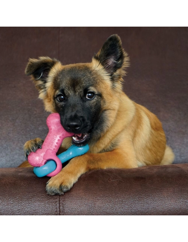 KONG ChewStix Puppy Link Bones é o primeiro brinquedo de roer de seu cão, feito com Nylon e Madeira de verdade formulado com toda segurança para seu filhote. Feito para direcionar desde as primeiras fases da vida, a mordida se seu cão para objetos seguros e desejáveis em vez de móveis e objetos da casa. Contém madeira de verdade para atrair seu cão, e uma suave fragrância de côco. Possui textura perfeita, não muito rígida e é uma solução duradoura para a fase de troca de dentes de seu cão