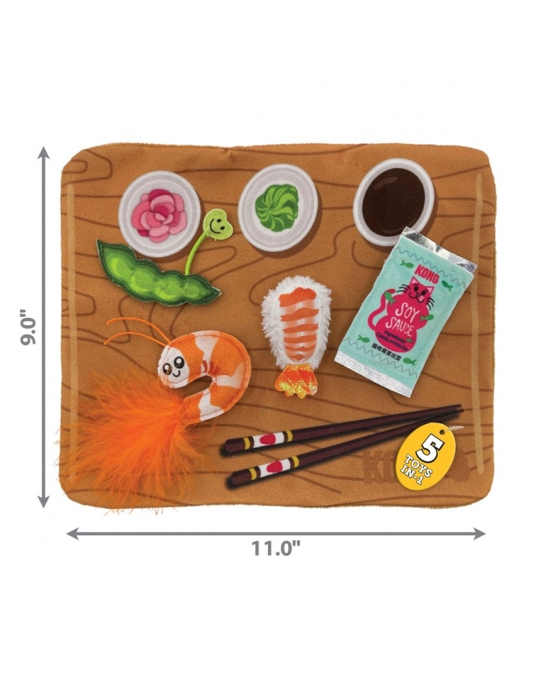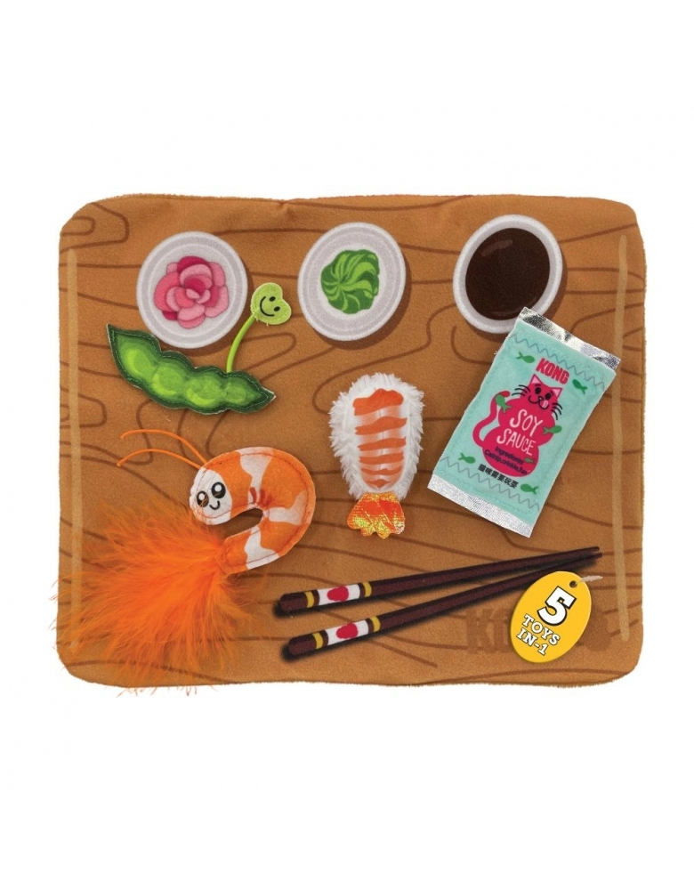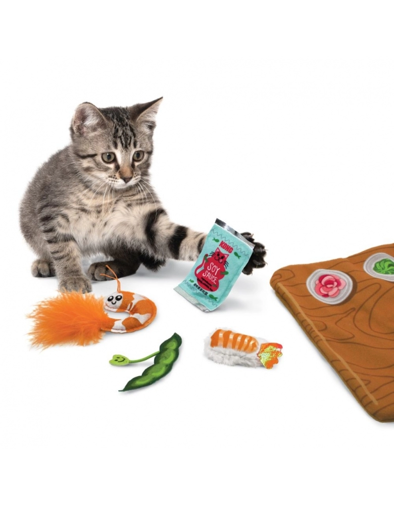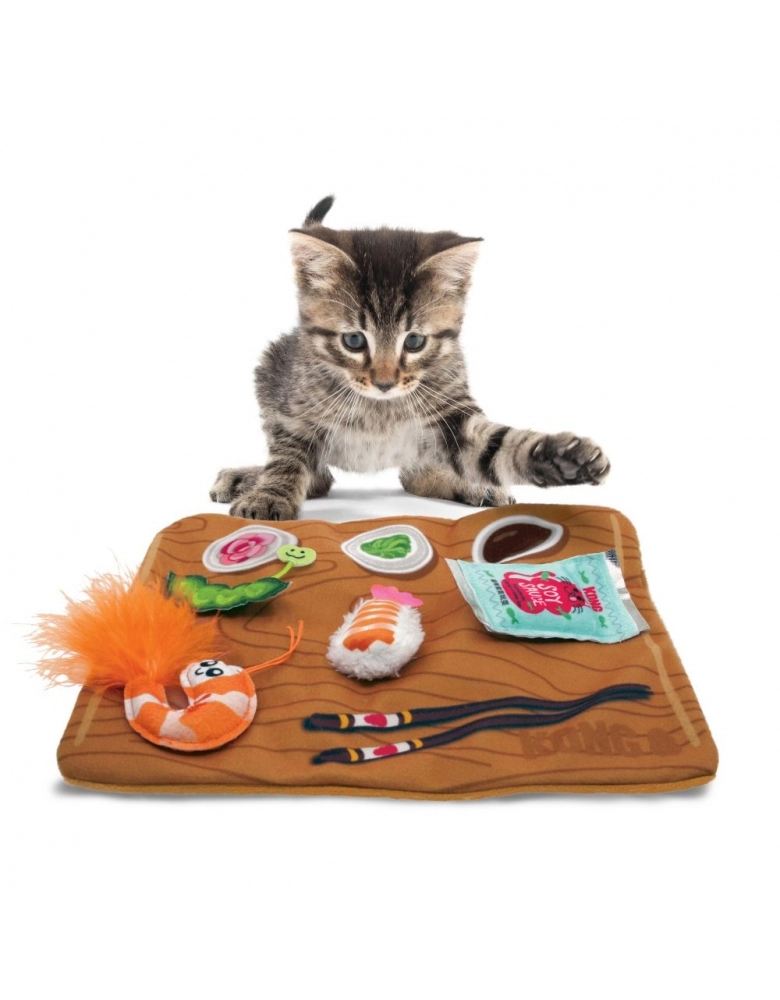 KONG Pull-A-Partz Sushi Pie oferece uma festa multissensorial de recompensas para gatos em um formato de tábua de sushi que convida a lutas. Puxar os brinquedos da taboa (feita de tecido) de sushi que ficam presos com velcro satisfaz instintos de desmantelar. Todos os brinquedos são recheados com o Catnip exclusivo da KONG. Os estalidos no corpo da tábua de sushi faz com que a brincadeira seja ainda mais estimulante. Importante: Inspecione o brinquedo com frequência e descarte caso apresente danos. Remova toda a embalagem antes de oferecer ao gato.