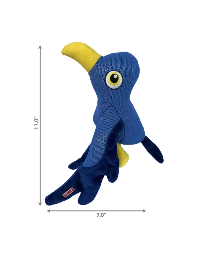 KONG Shakers Shimmy Seagul é um brinquedo desenvolvido para cães de mordida leve e não destruidores. Desenhados com asas gigantescas que satisfazem o intinto de chacoalhar a presa, dos cães. O corpo alongado torna o ato de chacoalhar mais divertido. Possui apitos com tom baixo para aumentar o engajamento. As asas possuem estalidos para estimular ainda mais o seu cão. Perfeito pra ser jogado em brincadeiras de jogar e trazer. Importante: Não é um objeto de roer. Não deve ser deixado sozinho com o cão nem por alguns minutos, até ter certeza de que o cão não irá destruí-lo,. Para cães com mordida forte e destruidores, prefira os brinquedos de borracha natural. Acabada a brincadeira, guarde para a próxima.