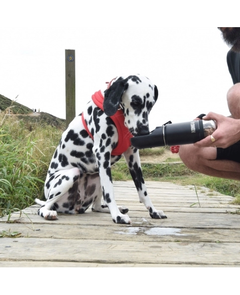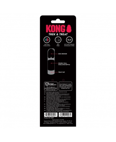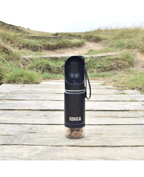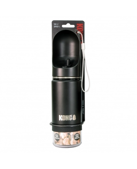 O KONG Trek and Treat combina praticidade inteligente com design elegante para levar consigo. Esta garrafa de aço inoxidável de parede dupla (295 ml) mantém a água fresca e possui um prático compartimento extra para snacks ou uma pequena refeição. Através do bebedouro integrado, pode facilmente dar água ao seu cão – o líquido escorre automaticamente de volta para a garrafa, sem desperdício. Ideal para passeios ou férias aventureiras com o seu amigo de quatro patas.