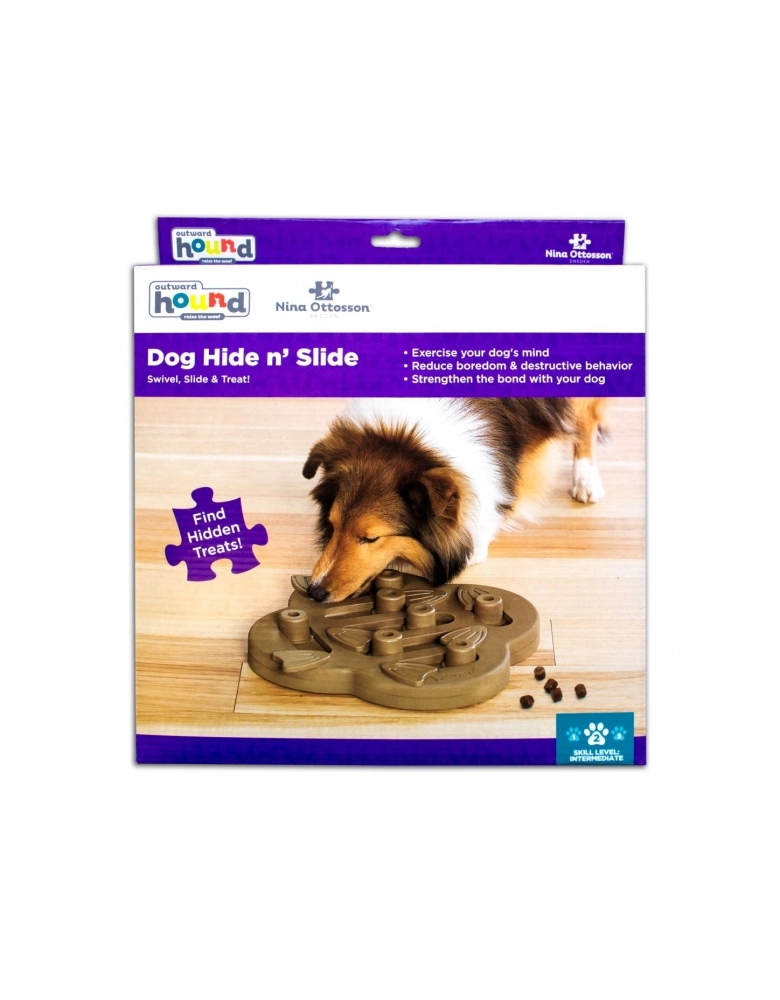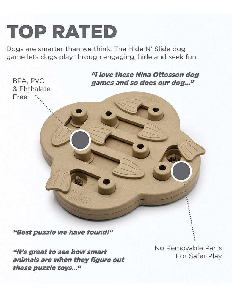 Você é novato com o Dog Hide n´slide? Cães são muito mais inteligentes que você pensa. Às vezes nós só precisamos ensiná-los. Deixe os flippers abertos para tornar esse jogo fácil e mostre ao seu cão como os blocos deslizam. Use petiscos realmente gostosos para que seu cão possa farejá-los. Queijo, bifinhos macios ou manteiga de amendoim funcionam muito bem. Para saber mais sobre os jogos da Nina Ottosson siga o perfil @lumare.import no