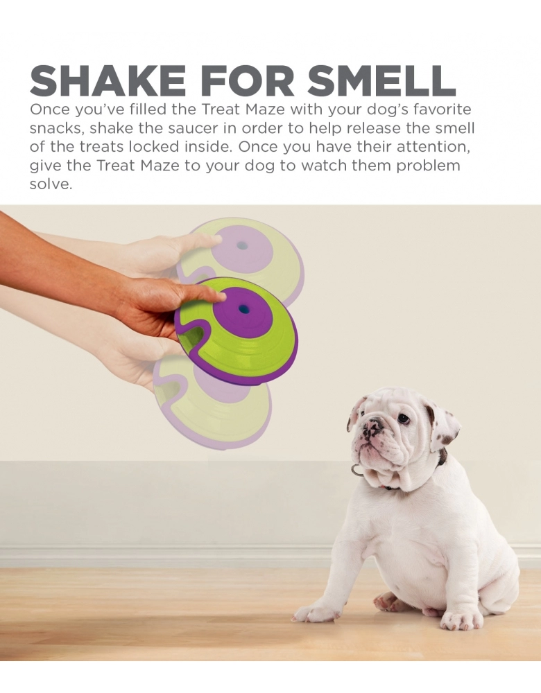 usar. Observe seu cão aprendendo. Ofereça a seu cão para que ele se mantenha ocupado e entretido. Modo de usar: 1 – Preencha com petiscos ou ração as duas aberturas, lateral e pelo topo. 2 – Chacoalhe e deixe seu cão sentir o cheiro e ficar animado. 3 – Mostre para seu cão como o brinquedo se movimenta e como os petiscos ou ração saem dos orifícios Limpeza: Lave usando água morna corrente da torneira e detergente neutro. Enxague completamente. Cuidados: Supervisione o uso o tempo todo. Inspecione regularmente se há danos e remova caso esteja quebrado. Se as partes se soltarem, poderão causar machucados. Destinado a cães somente. Mantenha fora do alcance das crianças. Este brinquedo deve ficar guardado até a próxima brincadeira e uso supervisionado. Não deixe seu cão mastigar ou roer as peças ou o brinquedo. Não há garantia quanto à destruição. Não é um brinquedo de roer.