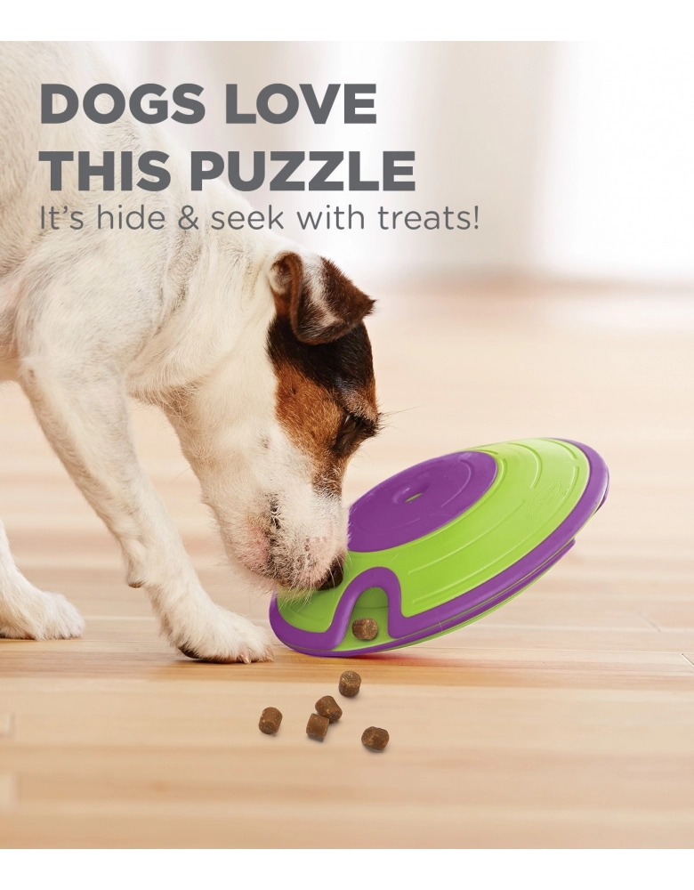 Este produto é nível 2 (intermediário) e visa exercitar a mente do seu cão para que ele encontre a melhor maneira de obter alimento. Este é um jogo de bater e virar e obter o alimento aos poucos. Ajuda a reduzir comportamentos indesejados, divertido e fácil de