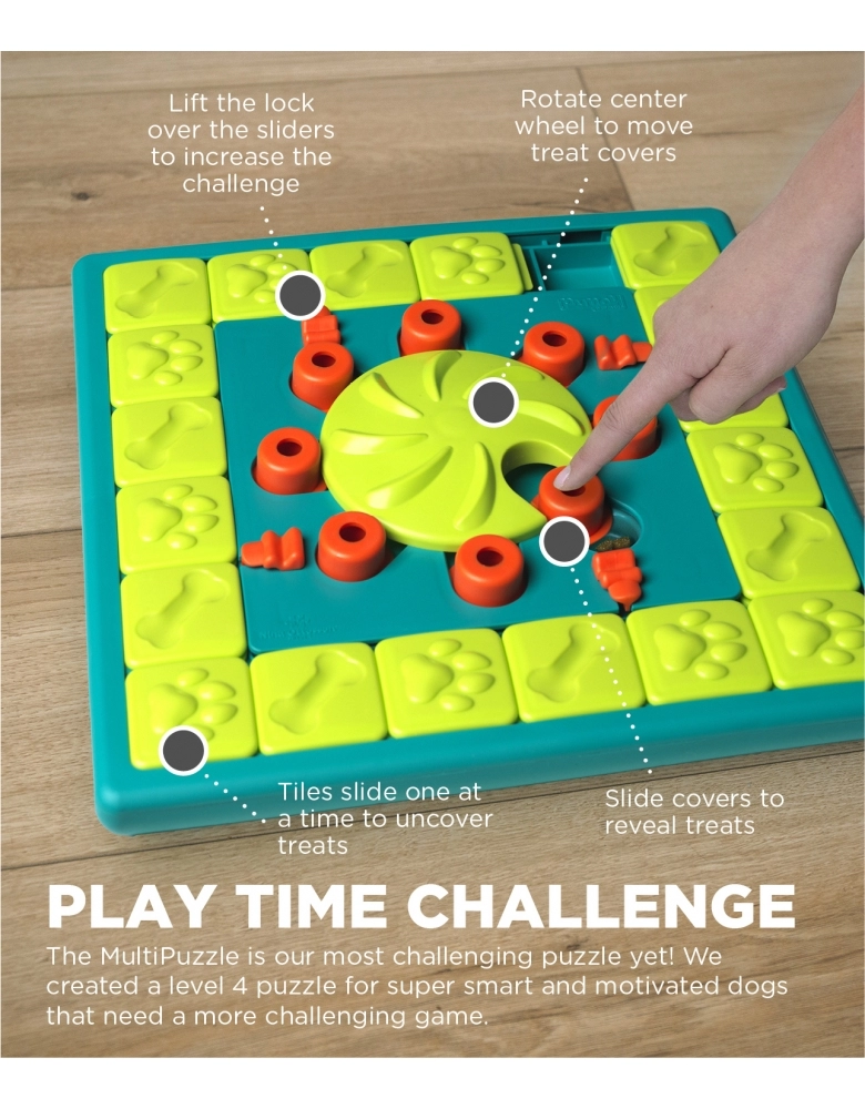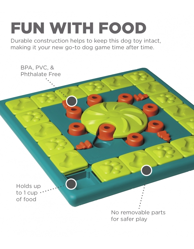 Este produto é nível 4 (avançado) . Possui 28 compartimentos e sliders para esconder petiscos. Seu cão precisará mover os sliders e girar a roda central com suas patas e focinho para chegar aos petiscos. Visa exercitar a mente do seu cão para que ele encontre a melhor maneira de obter alimento. Estreita os seus laços com o cão. Ajuda a reduzir comportamentos indesejados como roer, cavar, latidos excessivos simplesmente exercitando a mente de seu cão. É muito divertido e fácil de usar. Indicado para todos os cães independente de idade, tamanho ou raça. Fácil de limpar. Observe seu cão aprendendo. Ofereça a seu cão para que ele se mantenha ocupado e entretido. Não contém partes removíveis para uma brincadeira mais segura. Feito com materiais atóxicos. Não contém PVC, Ftalato ou BPA. É o jogo mais desafiador até agora!
