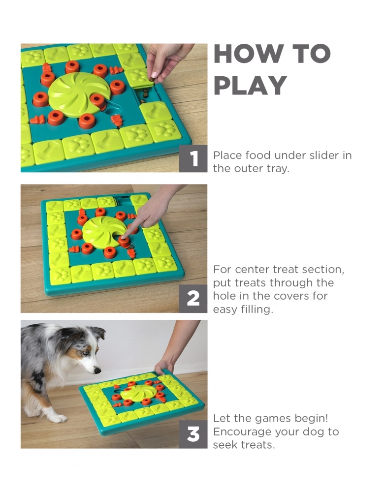 Modo de usar: 1 – Coloque os petiscos embaixo dos sliders na parte externa da bandeja. . 2 – Coloque os petiscos nos compartimentos centrais e esconda-os com as tampas. 3 – Que comecem os jogos! Coloque o jogo no chão e estimule seu cão a procurar pelos petiscos.