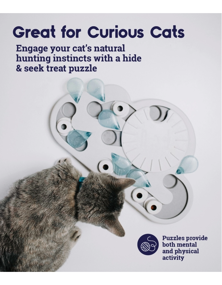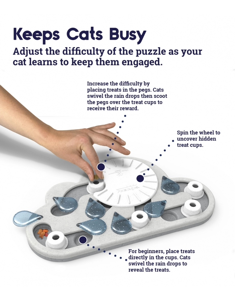 Modo de usar: 1 – Para iniciantes, coloque os petiscos nos orifícios. Para aumentar o desafio, coloque os petiscos no buraco dos sliders circulares. 2 – Deslize as gotas para cobrir os orifícios. 3 – Que comecem os jogos! Mostre a seu gato como a brincadeira funciona e encoraje-o a encontrar os petiscos.