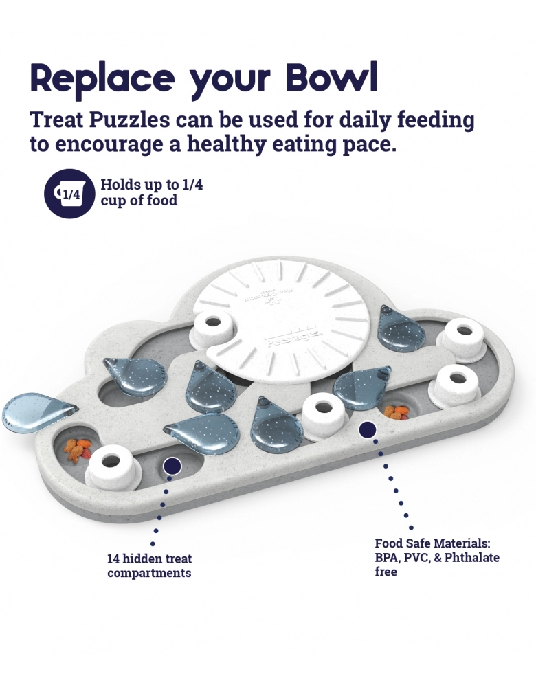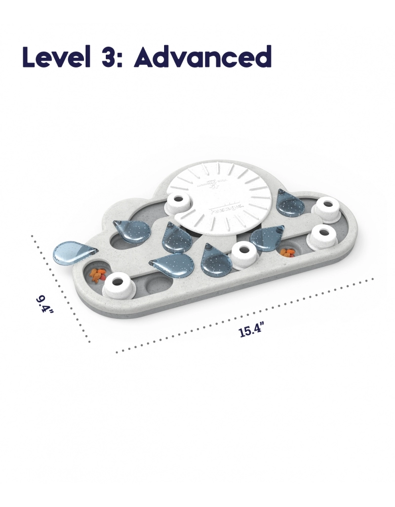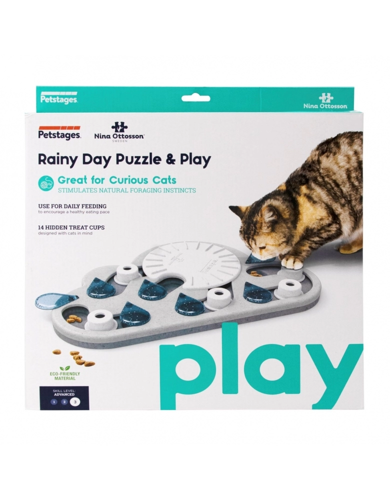 Rainy Day é um tabuleiro para gatos nível 3 – Avançado Possui 14 esconderijos de petiscos. Ajuste a dificuldade do tabuleiro e continue desafiando seu gato! Este brinquedo é especificamente desenvolvido para os gatos. Possui orifícios rasos para depositar petiscos. Fácil de limpar, não possui peças soltas para proporcionar uma brincadeira mais segura. Feito com materiais seguros, sem BPA, PVC ou ftalatos, nocivos aos animais e humanos. Feito para que você alimente seu gato com o brinquedo, evitando os comedouros que são tediosos e fazem com que seu gato coma muito depressa.