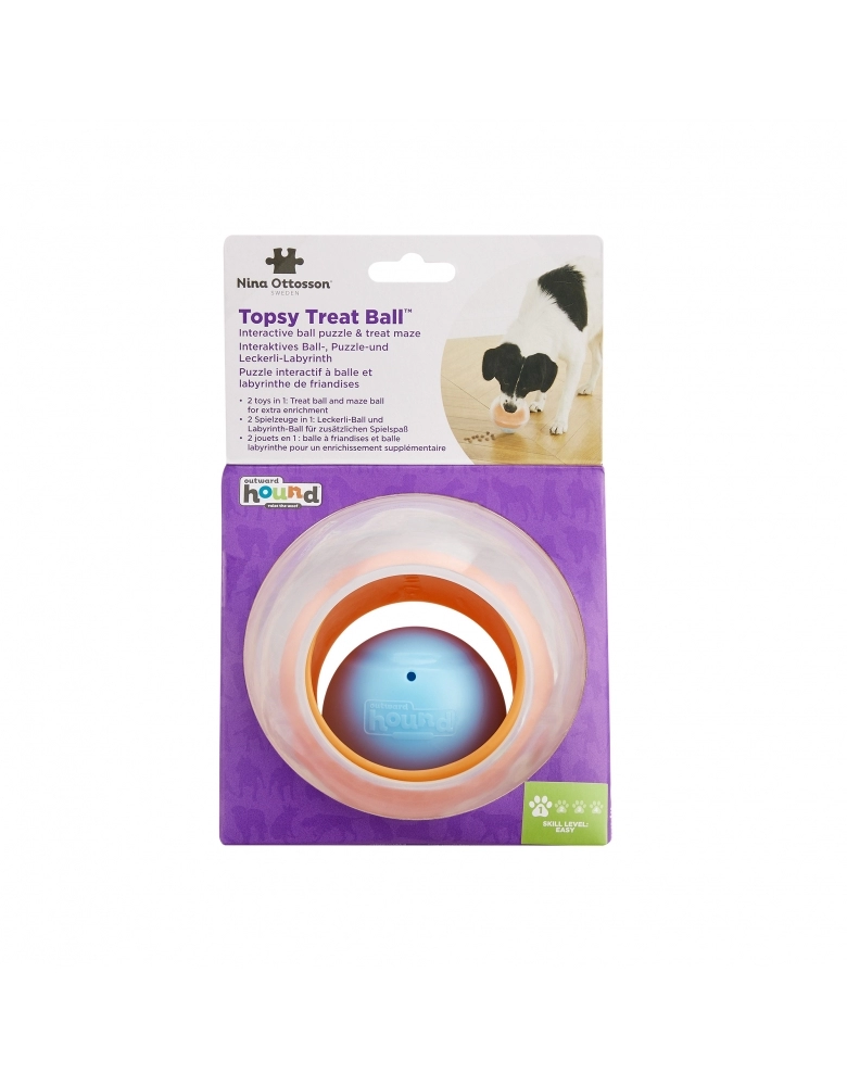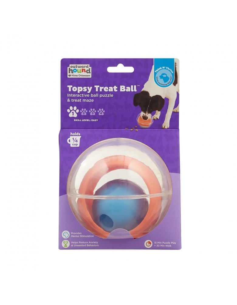 Outward Hound Nina Ottosson Topsy Treat Ball é nível 1 (novato) e visa exercitar a mente do seu cão para que ele encontre a melhor maneira de obter alimento. É um brinquedo de rolar, feito para ser recheado com petiscos ou alimento que seu cão irá amar. 15 minutos de brincadeiras com estímulos mentais, equivalem a 30 minutos de brincadeiras físicas. Todo cão é um vencedor com os brinquedos da Nina Ottosson da Outward Hound. . Torna a hora da refeição em um jogo interativo! Substitui o comedouro tradicional ajudando o cão a comer em um ritmo mais lento. Ajuda a reduzir comportamentos destrutivos exercitando a mente de seu cão.