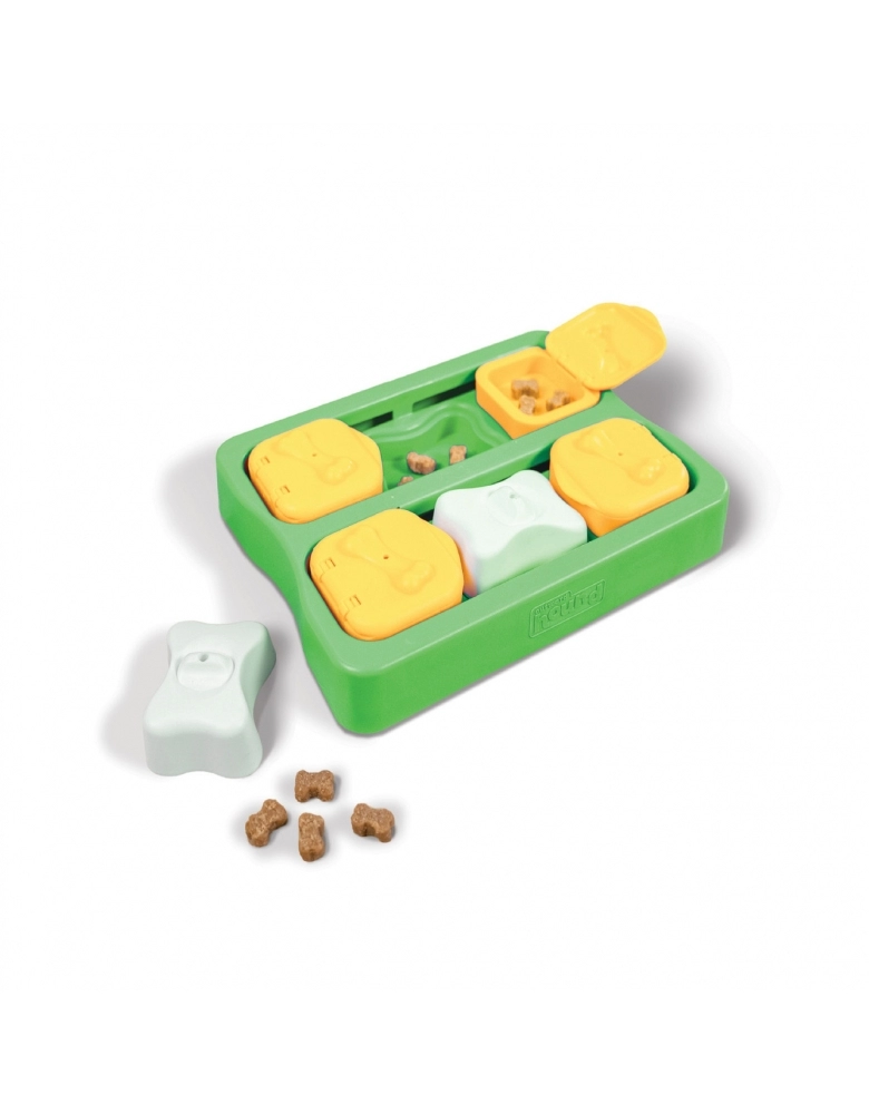 Modo de usar: 1 – Preencha com petiscos ou ração os compartimentos da base e blocos deslizantes. 2 – Cubra os compartimentos do meio com os ossos. Quanto mais compartimentos cobertos, mais difícil o jogo fica. 3 – Que comecem os jogos! Mostre ao seu cão como o jogo funciona e estimule-o a encontrar os petiscos ou alimento.