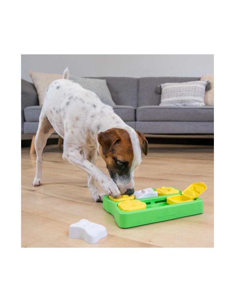 Cães são muito mais inteligentes que você pensa. Às vezes nós só precisamos ensiná-los. Deixe alguns compartimentos descobertos e mostre a seu cão os blocos deslizam e como abrem. Deixe alguns blocos abertos para ganhar o interesse do cão. Use petiscos realmente gostosos para que seu cão possa farejá-los. Queijo, bifinhos macios ou manteiga de amendoim funcionam muito bem. Para saber mais sobre os jogos da Nina Ottosson siga o perfil @lumare.import no Instagram. Serão publicados com frequência diversos vídeos educativos com bastante frequência.