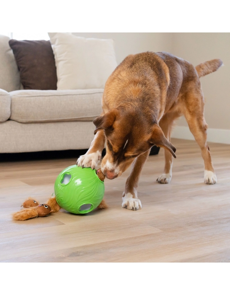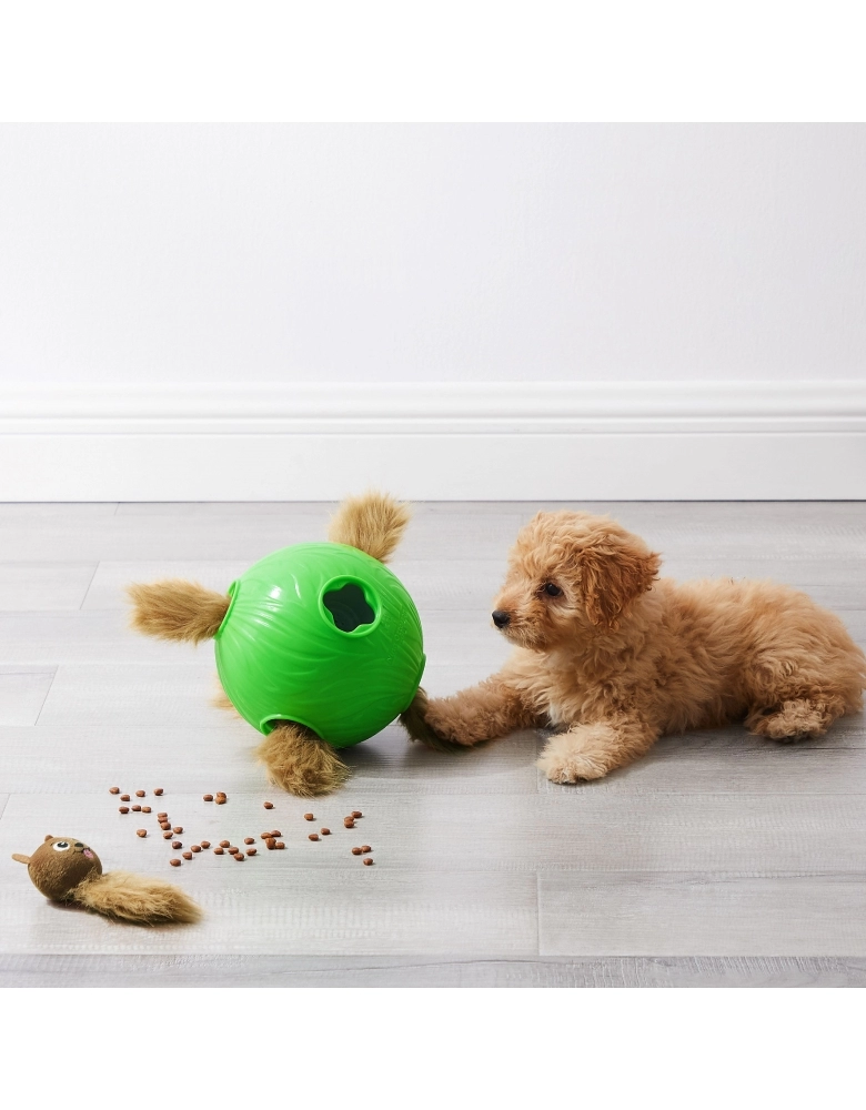 É um brinquedo Nível 2 (intermediário) em dificuldade. Trata-se de um quebra-cabeças em forma de bola onde você esconde petiscos embaixo dos bichinhos para o cão farejar e remover para comer. Inclui 6 esquilos para cobrir os compartimentos. Combate o tédio e provém estímulos mentais necessários para os cães. Estimula o cão a solucionar problemas, usando seus instinto de forrageamento. Ideal para cães de todas as idades.