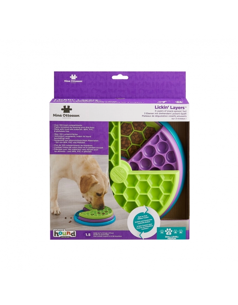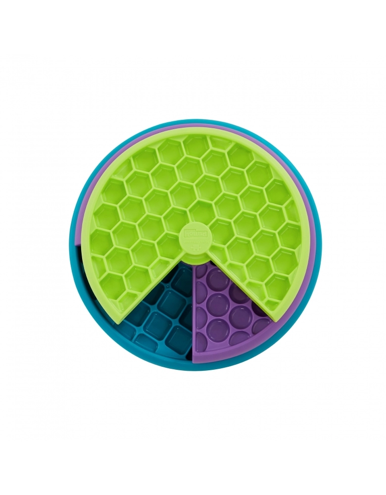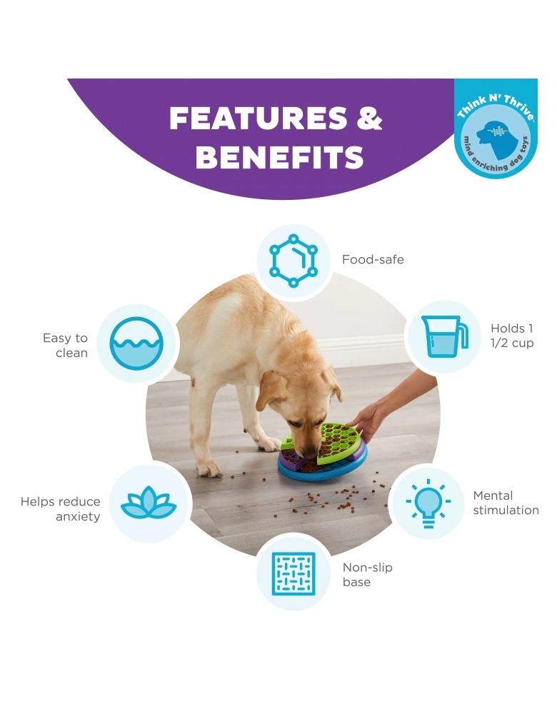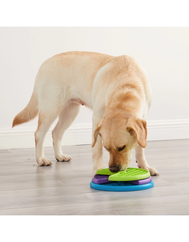 Comedouro lento misturado com quebra cabeças nível 2, que possui 3 camadas de diversão com recompensas. Perfeito no combate ao tédio porque mantém o cão ocupado e feliz. Feito com plástico de grau alimentar, sem BPA, PVC ou ftalato. Capacidade de 1 xícara de alimento seco ou meia de alimento úmido. Pode ser usado com alimento seco ou úmido. Perfeito para cães de todas as idades, tamanhos ou raças. Fácil de limpar.