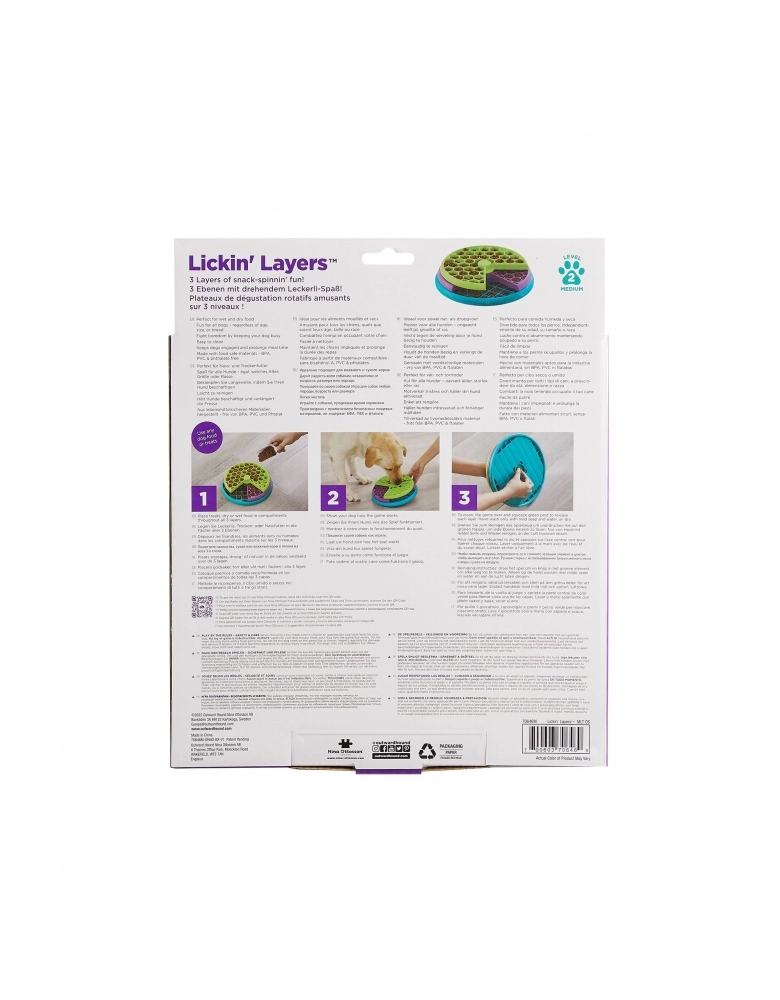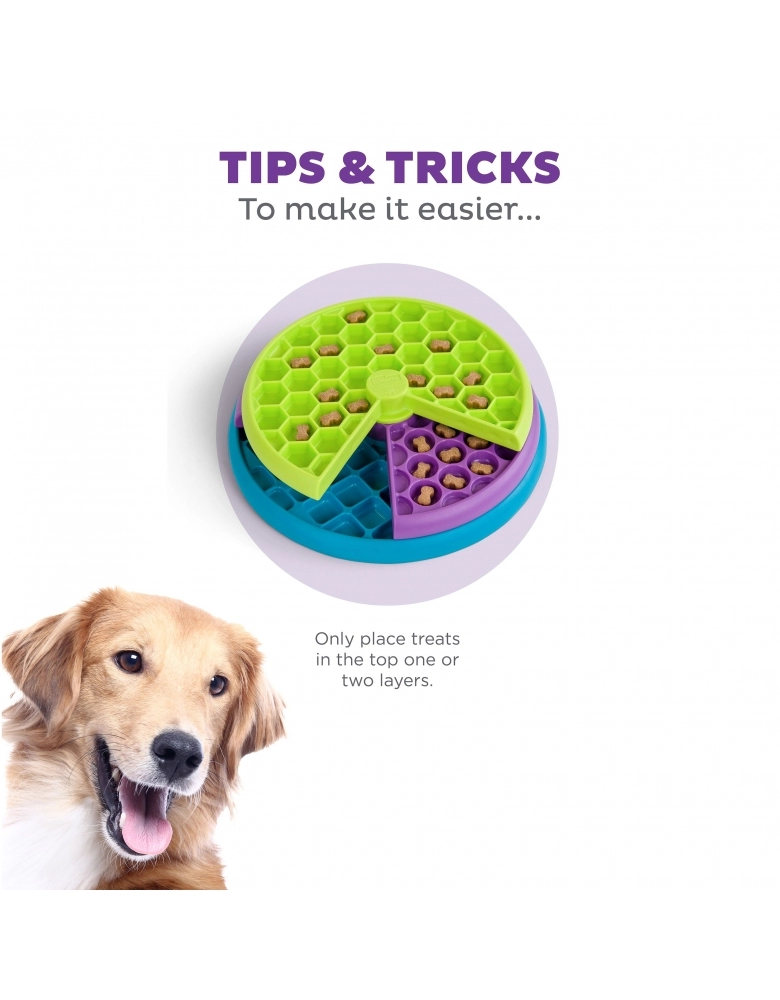 Instruções: 1 – Espalhe ração ou petiscos por todos os compartimentos nos 3 níveis. 2 – Deixe a brincadeira começar! Mostre a seu cão como o brinquedo funciona e encoraje-o a encontrar o alimento. 3 - Para limpar, coloque o jogo de cabeça para baixo e aperte simultaneamente as duas partes da trava para ir soltando cada camada.