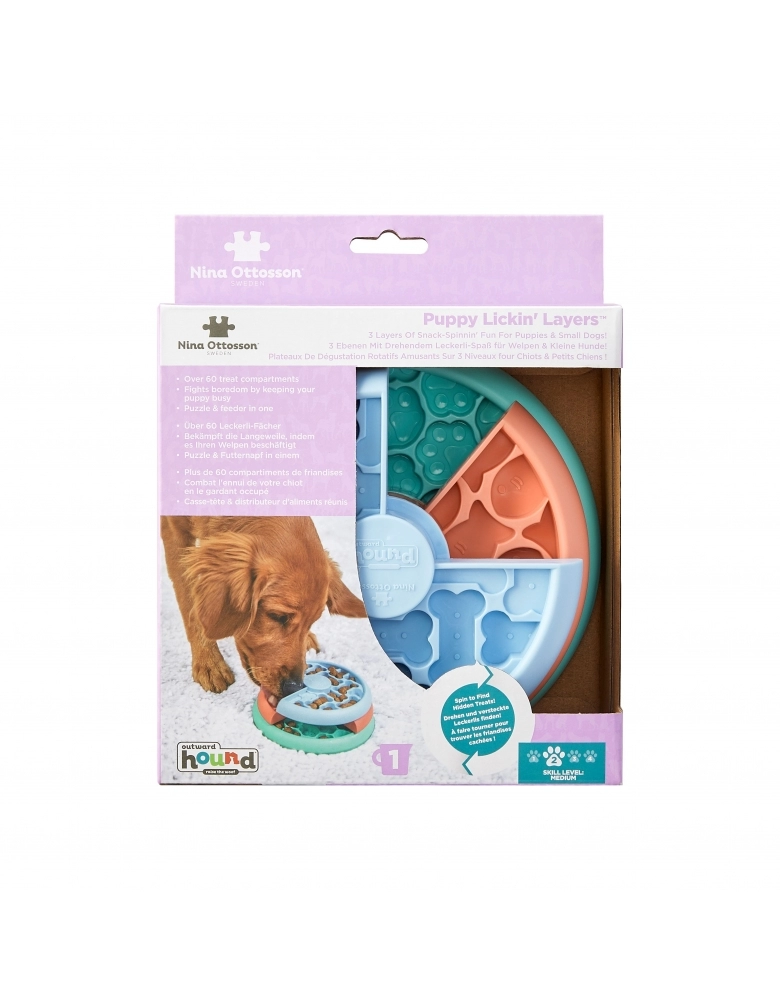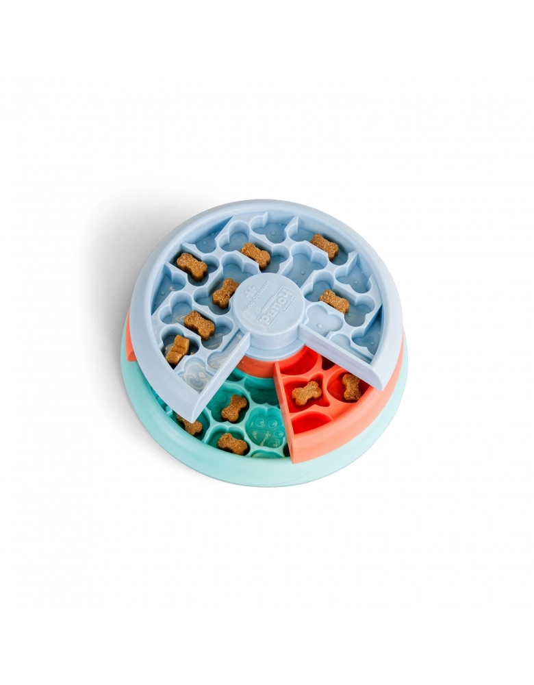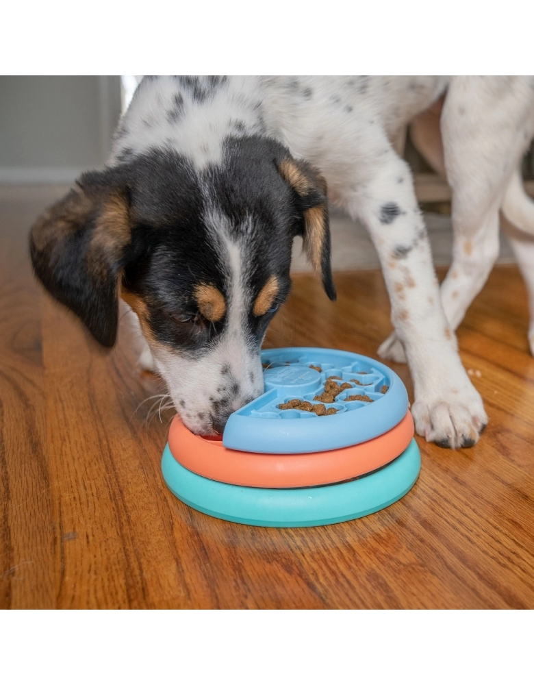 Comedouro lento misturado com quebra cabeças nível 2, que possui 3 camadas de diversão com recompensas. Perfeito no combate ao tédio porque mantém o cão ocupado e feliz. Feito com plástico de grau alimentar, sem BPA, PVC ou ftalato. Capacidade de 1 xícara de alimento seco ou meia de alimento úmido. Pode ser usado com alimento seco ou úmido. Perfeito para cães de todas as idades, tamanhos ou raças. Fácil de limpar.