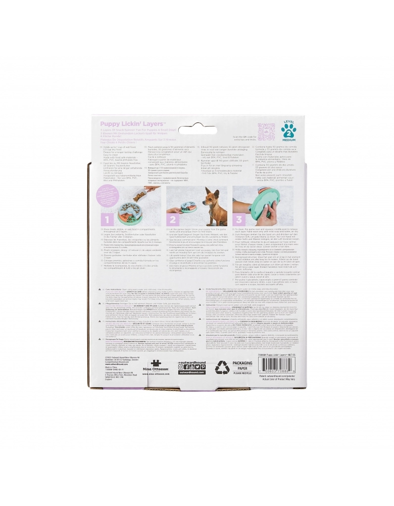 Instruções: 1 – Espalhe ração ou petiscos por todos os compartimentos nos 3 níveis. 2 – Deixe a brincadeira começar! Mostre a seu cão como o brinquedo funciona e encoraje-o a encontrar o alimento. 3 - Para limpar, coloque o jogo de cabeça para baixo e aperte simultaneamente as duas partes da trava para ir soltando cada camada.
