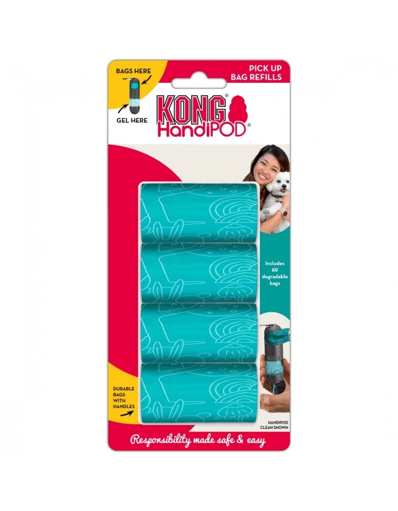 Contém 60 saquinhos degradáveis com alças convenientes. Saquinhos de alta qualidade e muito boa resistência. São fáceis de dar nó para descartar. Modo de Usar: Use como um saquinho regular de coletar dejetos ou em seu HandiPOD com gel ou lanterna