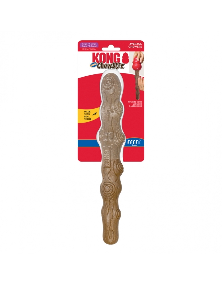 KONG ChewStix Mega Stick é um brinquedo para roer, feito com Nylon e Madeira de verdade. Contém madeira, o que proporciona uma mastigação mais saudável. Possui um cheiro de churrasco para recompensar e estimular o comportamento de roer. Se desfaz quando mordido para aumentar o estímulo de roer e, também, por segurança. A linha Mega é mais rígida e, portanto, durável que a linha ChewStix tradicional. Importante, escolha o tamanho correto baseando-se no peso de seu cão. Se encaixa nos KONGs Clássicos, caso queira aprimorar ainda mais a brincadeira.