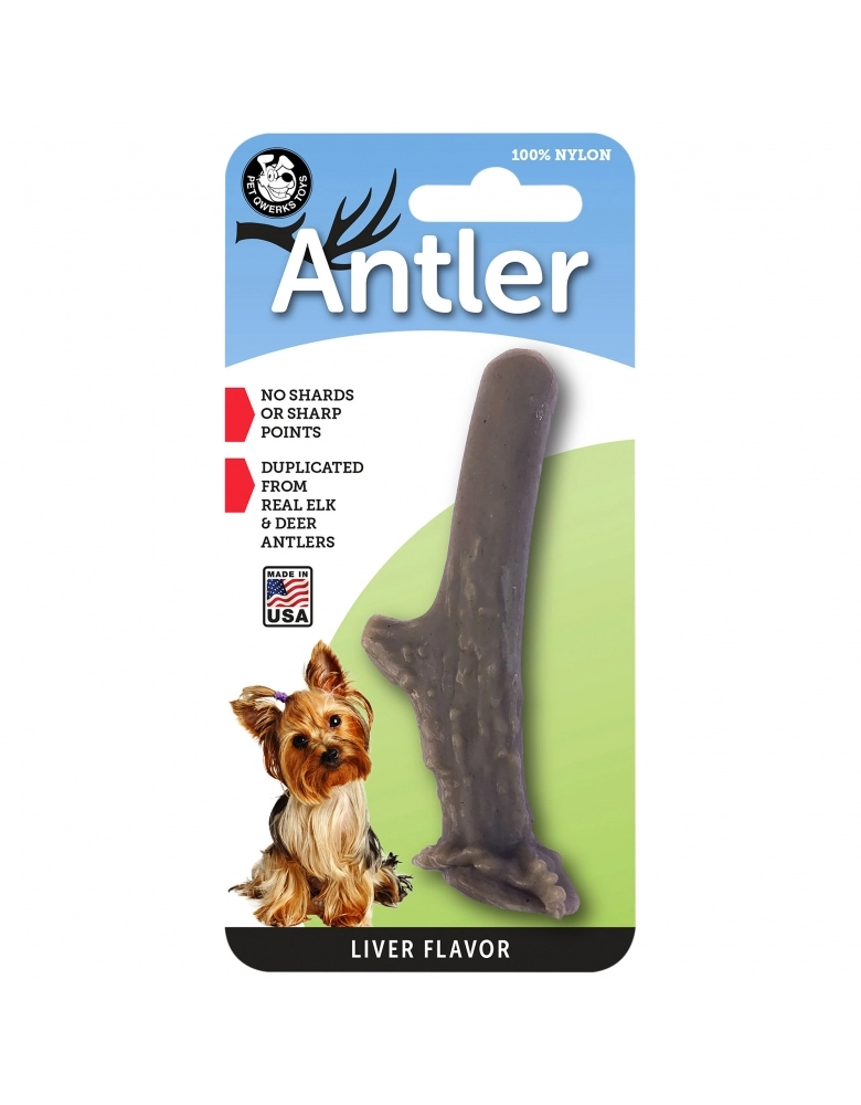 Antler Liver é um brinquedo de roer, fabricado com 100% nylon, madeira de verdade e com sabor de fígado para deixar seu cão estimulado. Como roer é um instinto natural de seu cão, oferecer Antler Liver poderá salvar suas cadeiras, móveis e sapatos. Direcionar o hábito de roer dos cães é muito mais saudável que reprimir. Fabricado com design exclusivo que simula os chifres de alce ou veado. Não tem pontas ou partes que podem machucar.