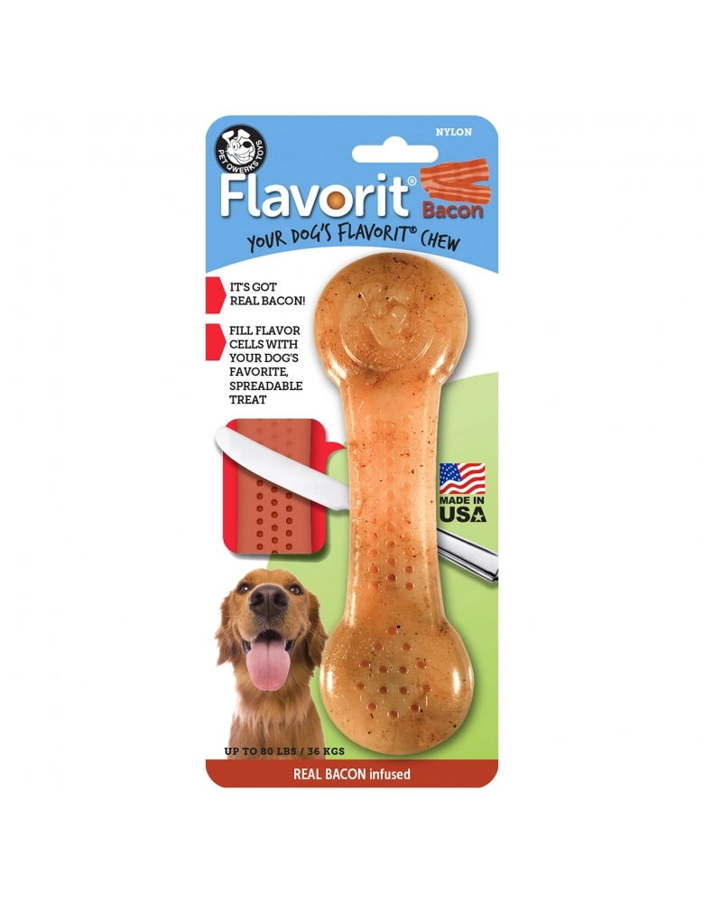 Flavorit ™ Bacon é um brinquedo de roer, fabricado com nylon hipoalergênico e bacon de verdade para deixar seu cão estimulado. A cor do produto é 100% proveniente do bacon! Como roer é um instinto natural de seu cão, oferecer Flavorit poderá salvar suas cadeiras, móveis e sapatos. Direcionar o hábito de roer dos cães é muito mais saudável que reprimir. Fabricado com design exclusivo, possui furos para serem preenchidos com o petisco pastoso favorito de seu cão. Exemplos: Pasta de amendoim, iogurte, abóbora, banana, ração em patê, etc.