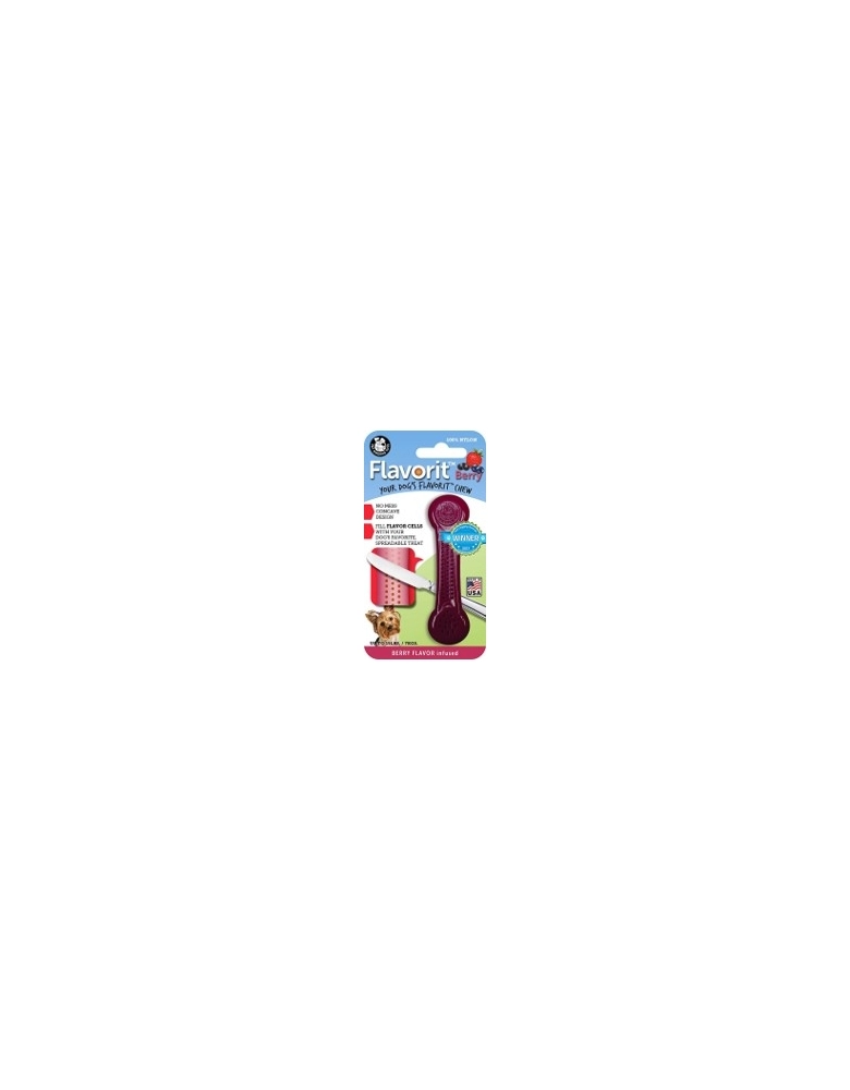 Flavorit ™ Berry é um brinquedo de roer, fabricado com 100% nylon e com sabor berry (frutas pequenas vermelhas) para deixar seu cão estimulado. Como roer é um instinto natural de seu cão, oferecer Flavorit poderá salvar suas cadeiras, móveis e sapatos. Direcionar o hábito de roer dos cães é muito mais saudável que reprimir. Fabricado com design exclusivo, possui furos para serem preenchidos com o petisco pastoso favorito de seu cão. Exemplos: Pasta de amendoim, iogurte, abóbora, banana, ração em patê, etc.