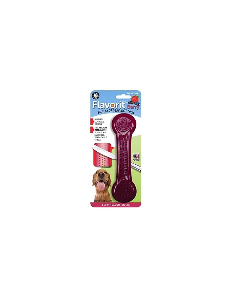 Flavorit ™ Berry é um brinquedo de roer, fabricado com 100% nylon e com sabor berry (frutas pequenas vermelhas) para deixar seu cão estimulado. Como roer é um instinto natural de seu cão, oferecer Flavorit poderá salvar suas cadeiras, móveis e sapatos. Direcionar o hábito de roer dos cães é muito mais saudável que reprimir. Fabricado com design exclusivo, possui furos para serem preenchidos com o petisco pastoso favorito de seu cão. Exemplos: Pasta de amendoim, iogurte, abóbora, banana, ração em patê, etc.