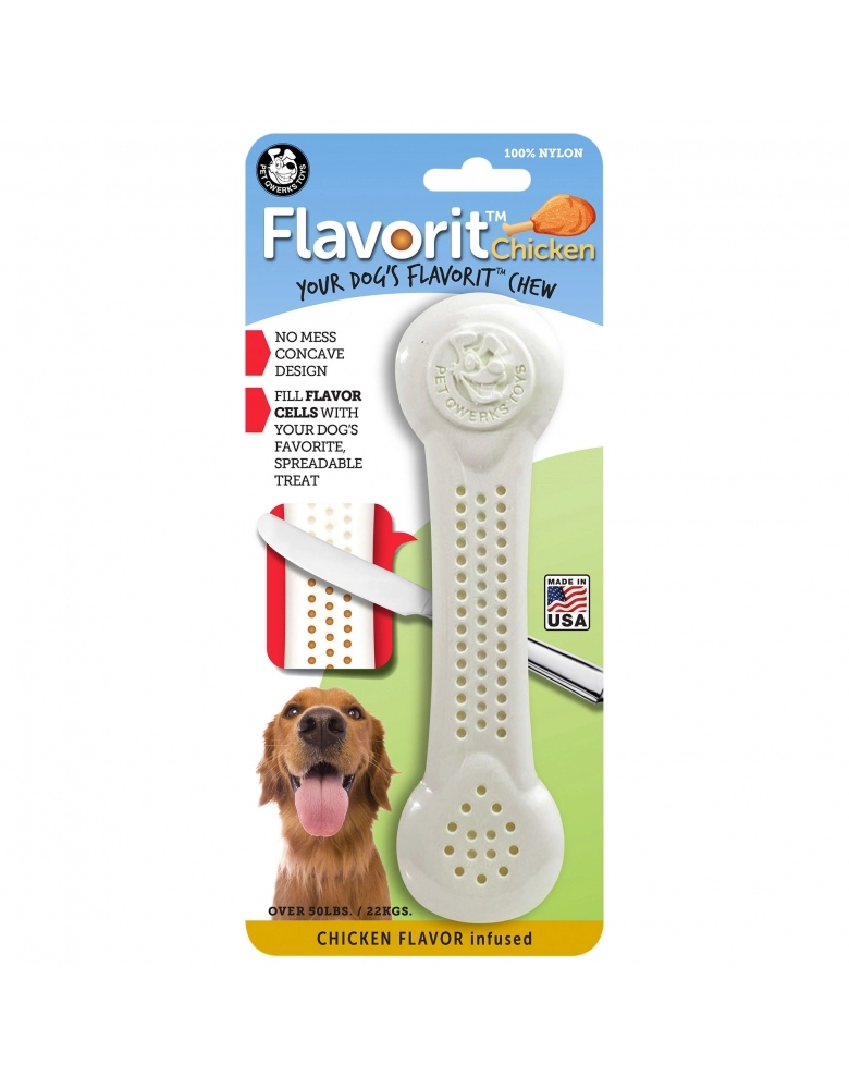Flavorit ™ Chicken é um brinquedo de roer, fabricado com 100% nylon e com sabor de frango para deixar seu cão estimulado. Como roer é um instinto natural de seu cão, oferecer Flavorit poderá salvar suas cadeiras, móveis e sapatos. Direcionar o hábito de roer dos cães é muito mais saudável que reprimir. Fabricado com design exclusivo, possui furos para serem preenchidos com o petisco pastoso favorito de seu cão. Exemplos: Pasta de amendoim, iogurte, abóbora, banana, ração em patê, etc.