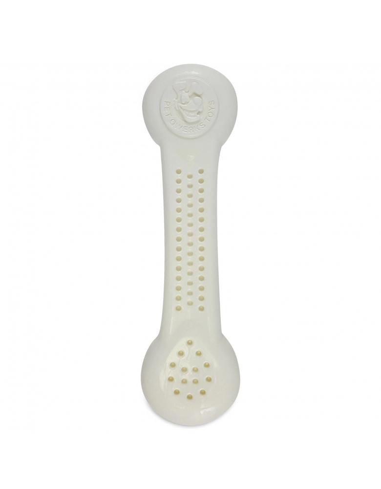 Cuidados: Se houver mais de um cão na casa, compre o maior tamanho possível para evitar risco de ser engolido. Não dê a seu cão se houver dúvidas sobe a saúde dentária dele. Pode contribuir para a quebrar de um dente já danificado. Na dúvida, não use. Nunca deixe sozinho com o cão especialmente nas primeiras vezes para ter certeza que é seguro. Não é um produto comestível. À medida que o cão rói, vai se desfazendo. Caso o cão ingira pequenos grânulos, não há problemas. Porém se quebrar em pedaços, descontinue o uso. Ideal para cães de mordida moderada. Mastigadores poderosos, procure por versões mais rígidas como Barkbone Dinosaur Bone por exemplo. Descarte quando o produto apresentar sinais de desgaste excessivo perdendo sua forma original.