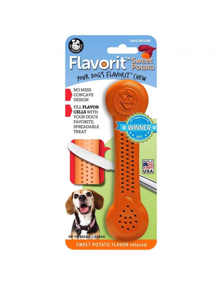 Flavorit ™ Sweet Potato é um brinquedo de roer, fabricado com 100% nylon e com sabor de batata doce para deixar seu cão estimulado. Como roer é um instinto natural de seu cão, oferecer Flavorit poderá salvar suas cadeiras, móveis e sapatos. Direcionar o hábito de roer dos cães é muito mais saudável que reprimir. Fabricado com design exclusivo, possui furos para serem preenchidos com o petisco pastoso favorito de seu cão. Exemplos: Pasta de amendoim, iogurte, abóbora, banana, ração em patê, etc.