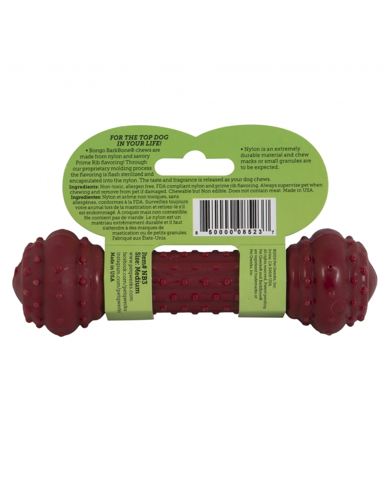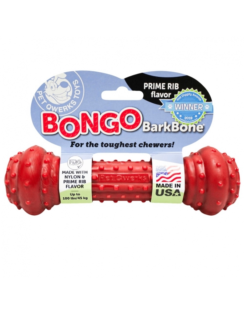Bongo Barkbone é um brinquedo de roer, fabricado com nylon e saborizante com essência de Costela Prime para deixar seu cão estimulado. Como roer é um instinto natural de seu cão, oferecer Bongo Barkbone poderá salvar suas cadeiras, móveis e sapatos. Direcionar o hábito de roer dos cães é muito mais saudável que reprimir. Fabricado com design exclusivo, é ergonômico para facilitar a pegada. Destinado a cães com mordida poderosa. À medida que vai sendo roído, vai liberando mais cheiro e sabor.