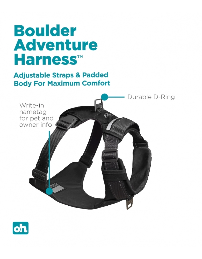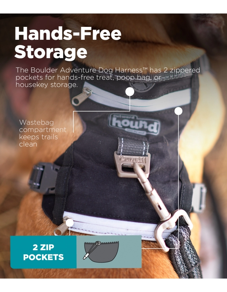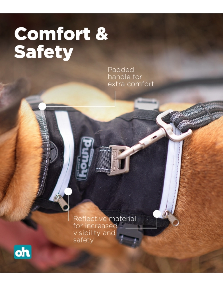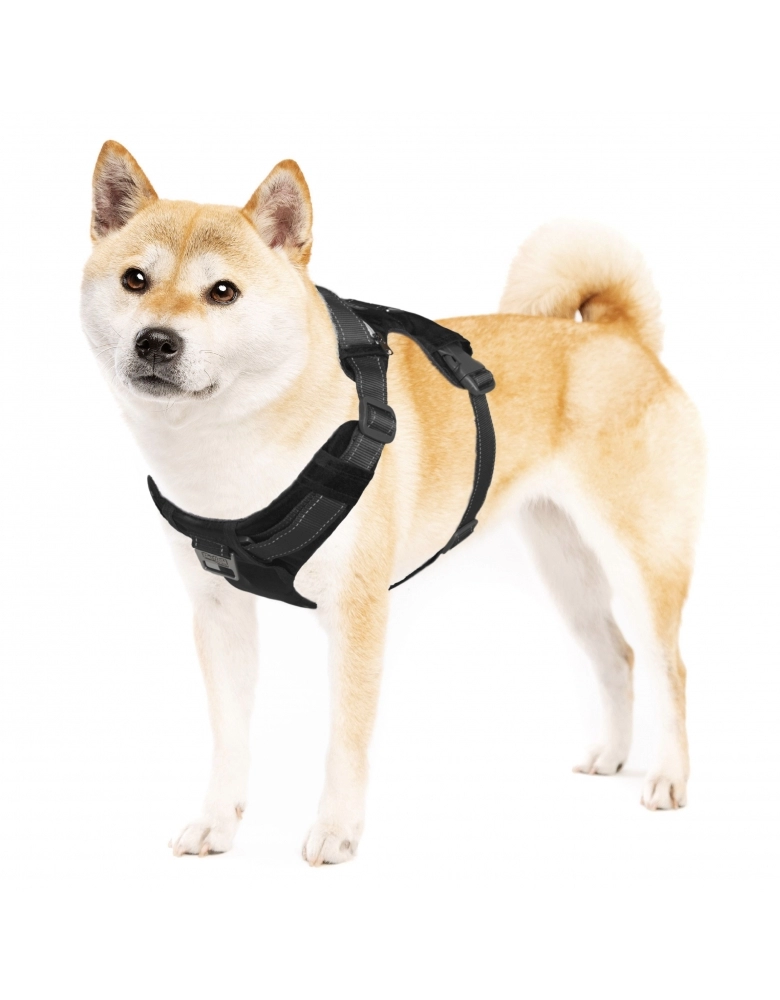 Esta peitoral possui tiras ajustáveis e corpo acolchoado para prover o máximo conforto sem abrir mão da máxima segurança. Possui 2 argolas em D, uma nas costas e outra no peito, para guias de ponta dupla e treinamento para não puxar. É feito para durar, pois possui tecido ante rasgo e costuras super reforçadas. Tem 2 bolsos para carregar o essencial. Possui um local para que escreva o nome do cão e seu telefone. Possui material refletivo para maior visibilidade e segurança à noite. Um dos bolsos serve para colocar saquinhos cata-caca e removê-los facilmente.