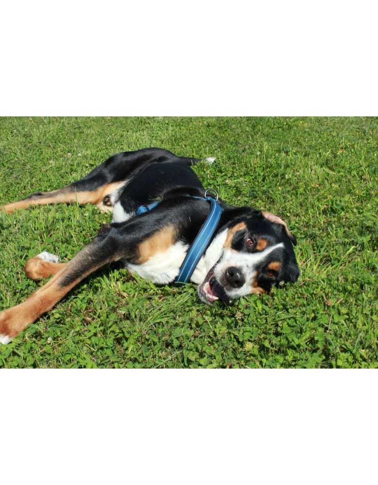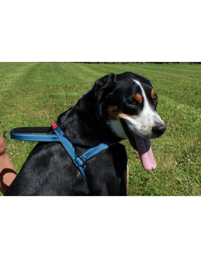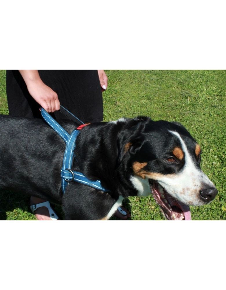 Feito de nylon reforçado e neoprene para garantir conforto, durabilidade e resistência. Com uma alça acima da cabeça, ajustes para o peito e fecho único torna o muito fácil de vestir e remover. Possui pontos refletivos em toda extensão para segurança nos passeios noturnos.
