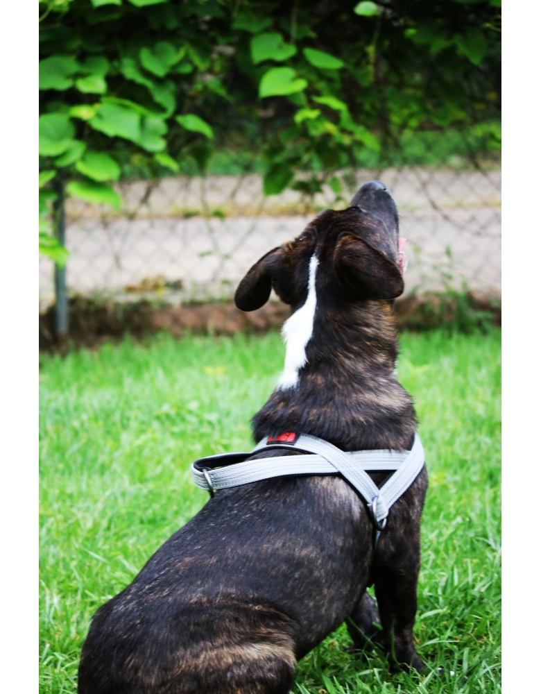 Feito de nylon reforçado e neoprene para garantir conforto, durabilidade e resistência. Com uma alça acima da cabeça, ajustes para o peito e fecho único torna o muito fácil de vestir e remover. Possui pontos refletivos em toda extensão para segurança nos passeios noturnos.